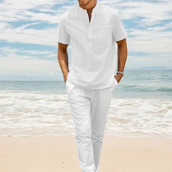Select options This product has multiple variants. The options may be chosen on the product pageSummer New Men’s Casual Sets Henley Neck T-shirt Straight Leg Pants Solid Color Vacation Hawaii Style Breathable Suit