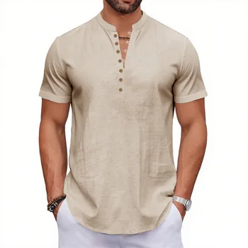 Select options This product has multiple variants. The options may be chosen on the product pageSummer New Men’s Short Sleeve Cotton Linen T-shirt Half Button Henley Neck Solid Color Breathable Lightweight Male Tops