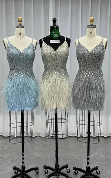 Select options This product has multiple variants. The options may be chosen on the product pageYQLNNE 0129 Beige Feathers Short Evening Dresses Straps Crystals Beaded Formal Women Wedding Party Gown