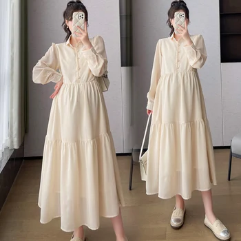 Select options This product has multiple variants. The options may be chosen on the product page2025 Autumn Maternity Brief Dress Solid Color Long Sleeve Turn-down Collar Plus Size Pregnant Woman Elegant Chiffon Dress Beige