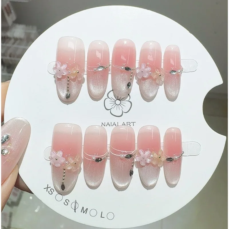 10PCS 3D Flower Glitter Golden Medium Oval Handmade French Press on Nail Sweet Pink Cat Eye Fake Nail with Glue Bowknot Wearable