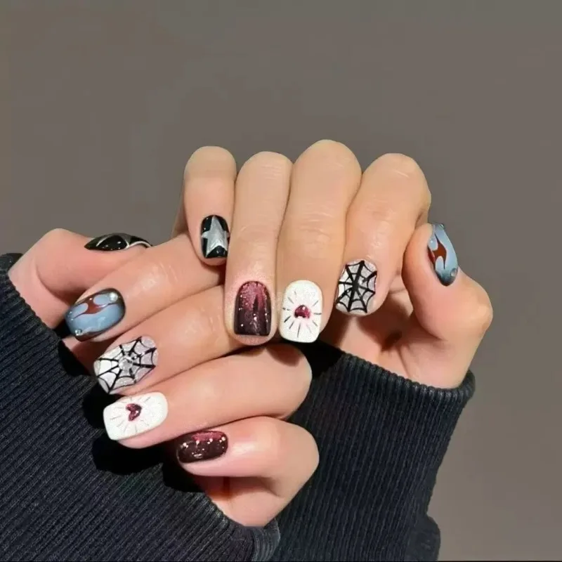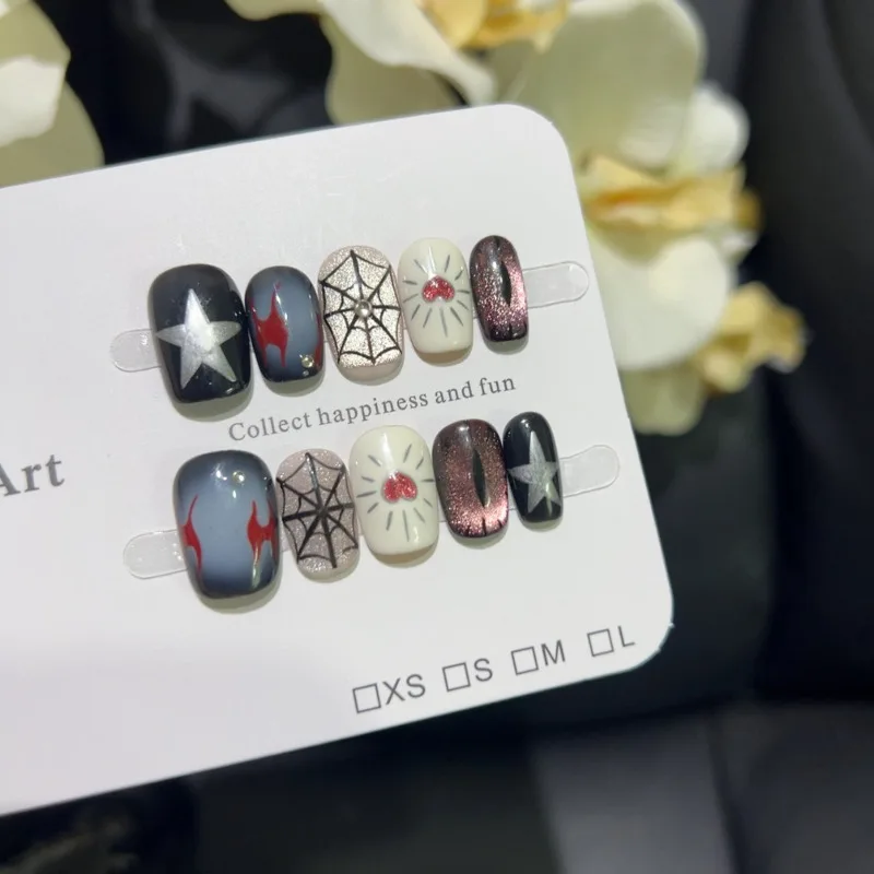 10PCS Black White Cat Eye Handmade Square Fake Nails Metallic Silver Pattern Nail Carving Flower French Wearable Press on Nails