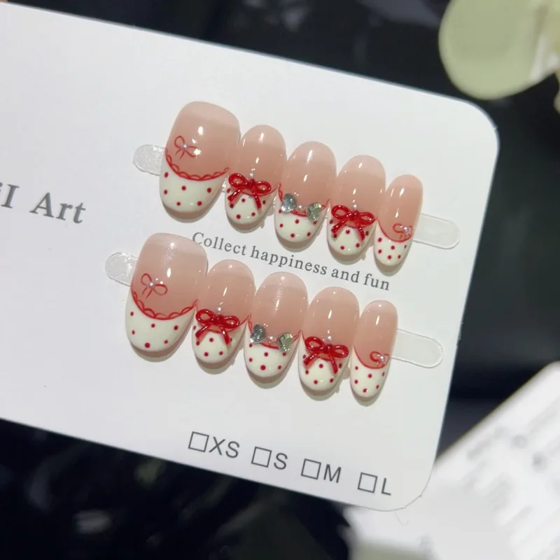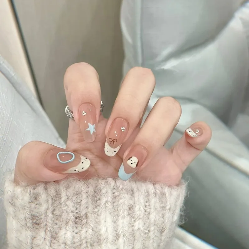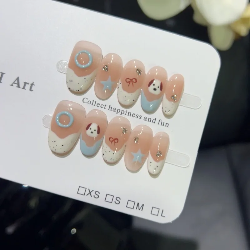 10PCS Cute Cartoon Dog Patterns Short Oval Press on Nails Cream Graffiti Bow French Handmade Sweet Fake Nails Wearable Nail Tips