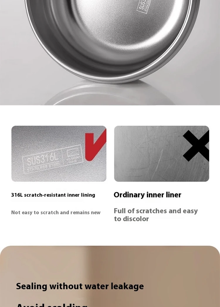 316 Stainless Steel Inner Lining: Fast heat conduction, corrosion-resistant, scratch-resistant, and long-lasting.
