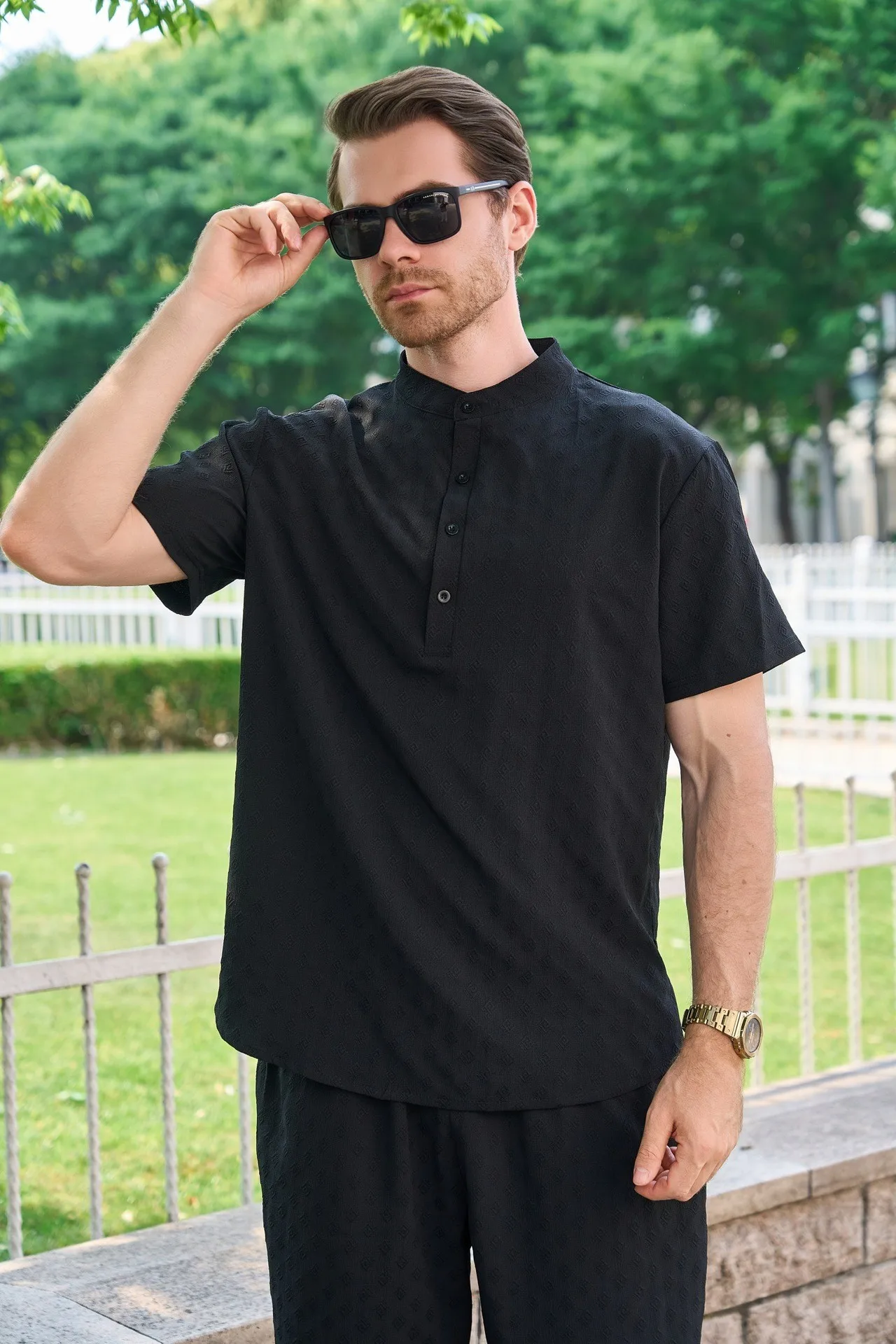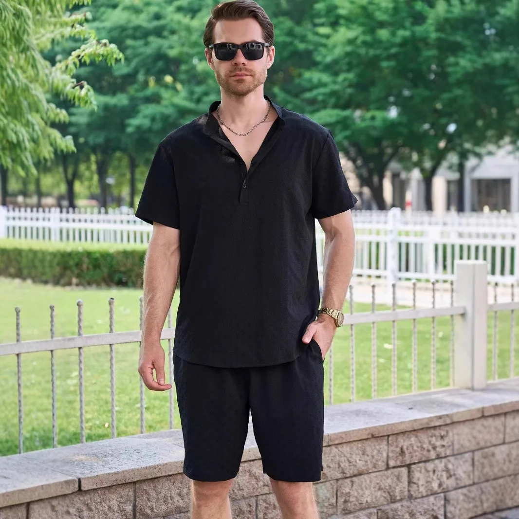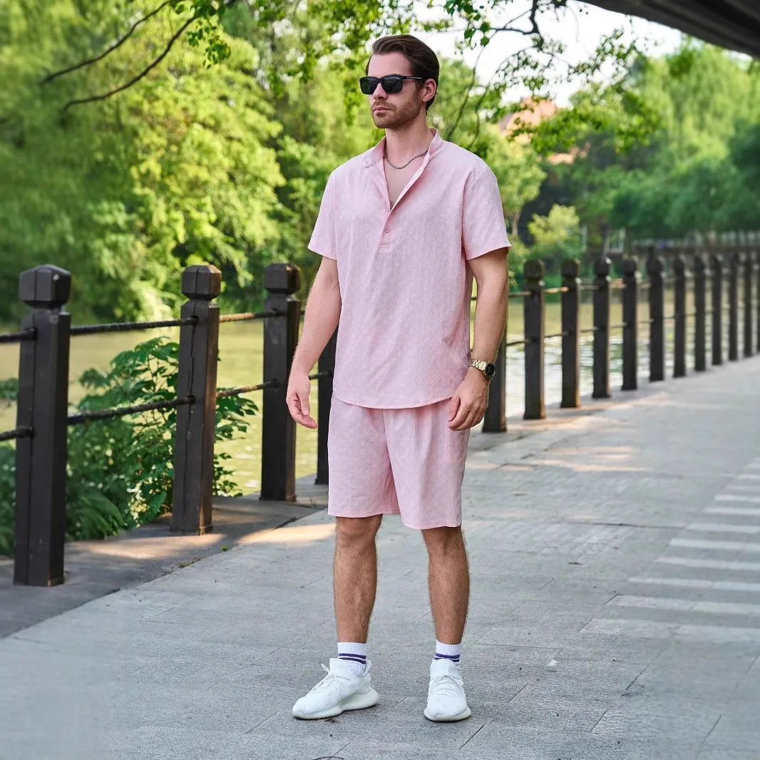 Men’s outdoor casual jacquard stand-up collar button short-sleeved T-shirt, POLO shirt and shorts set