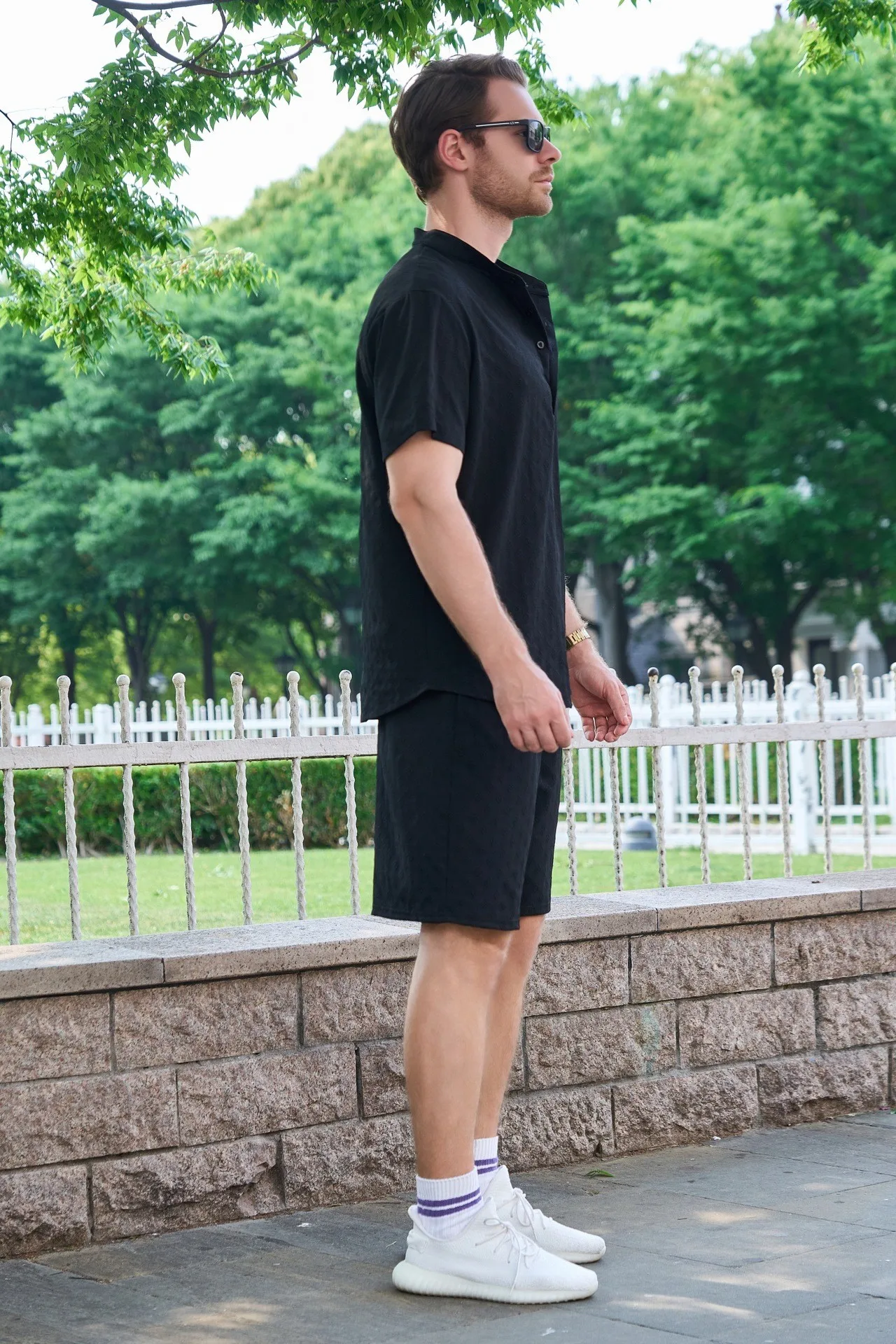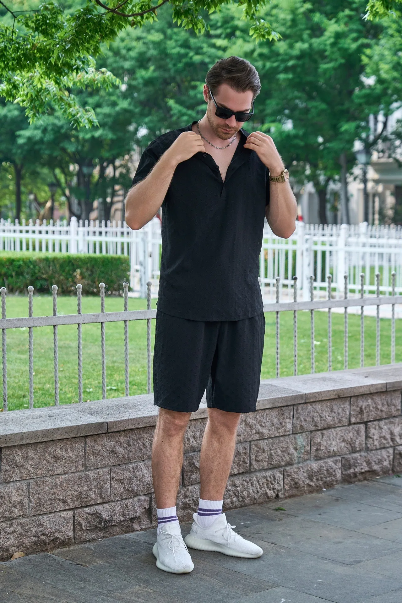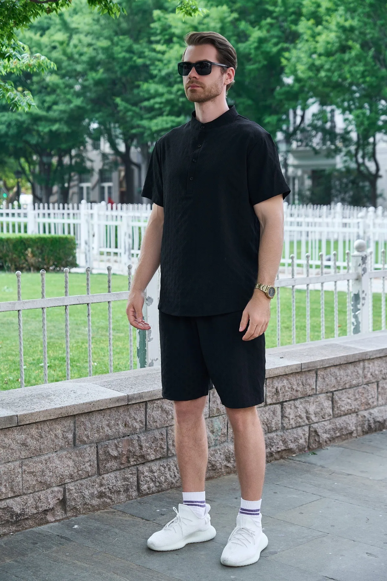 Men’s outdoor casual jacquard stand-up collar button short-sleeved T-shirt, POLO shirt and shorts set