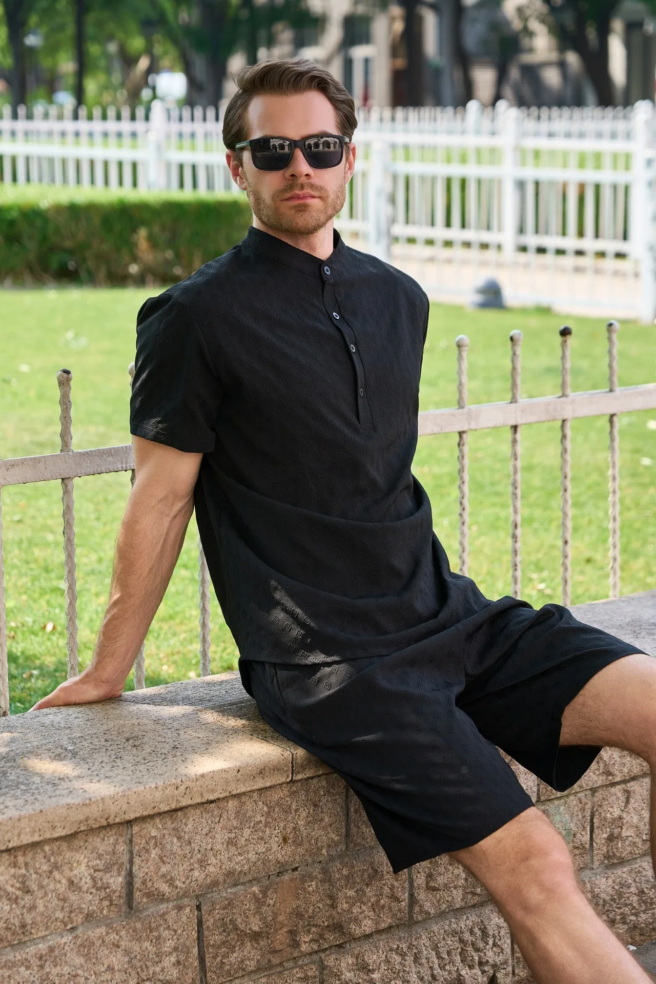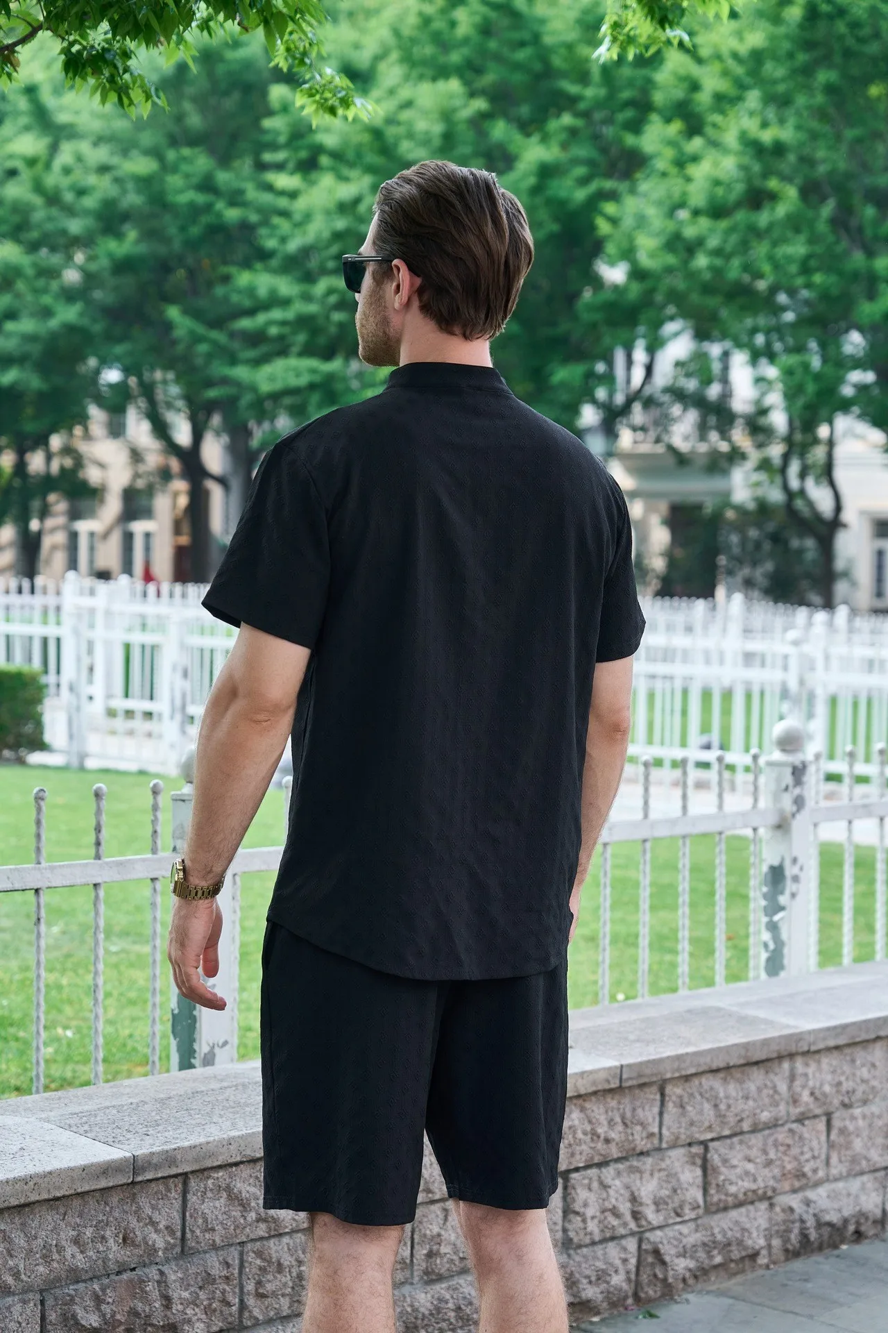Be the first to review “Men’s outdoor casual jacquard stand-up collar button short-sleeved T-shirt, POLO shirt and shorts set”