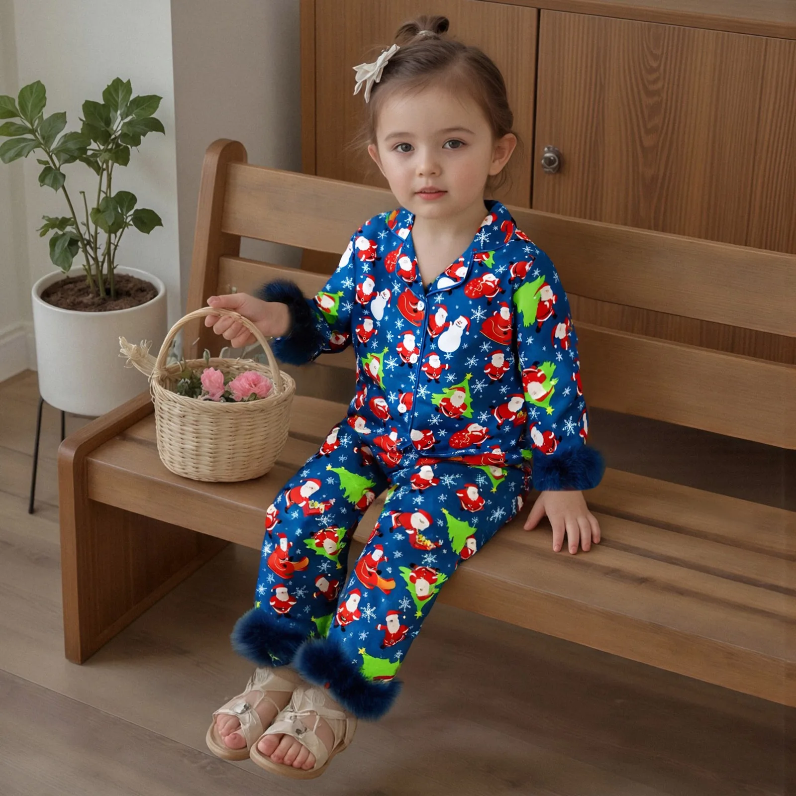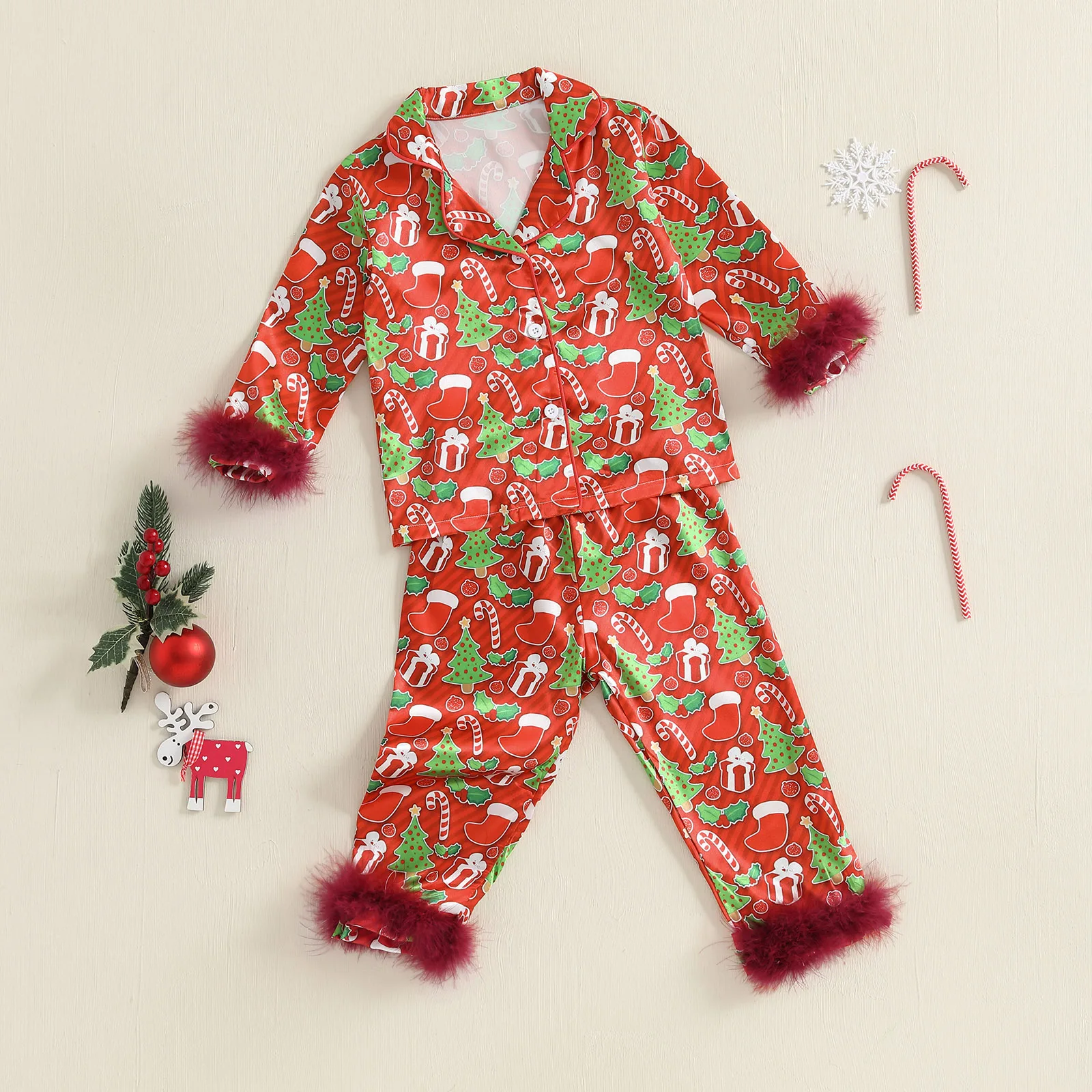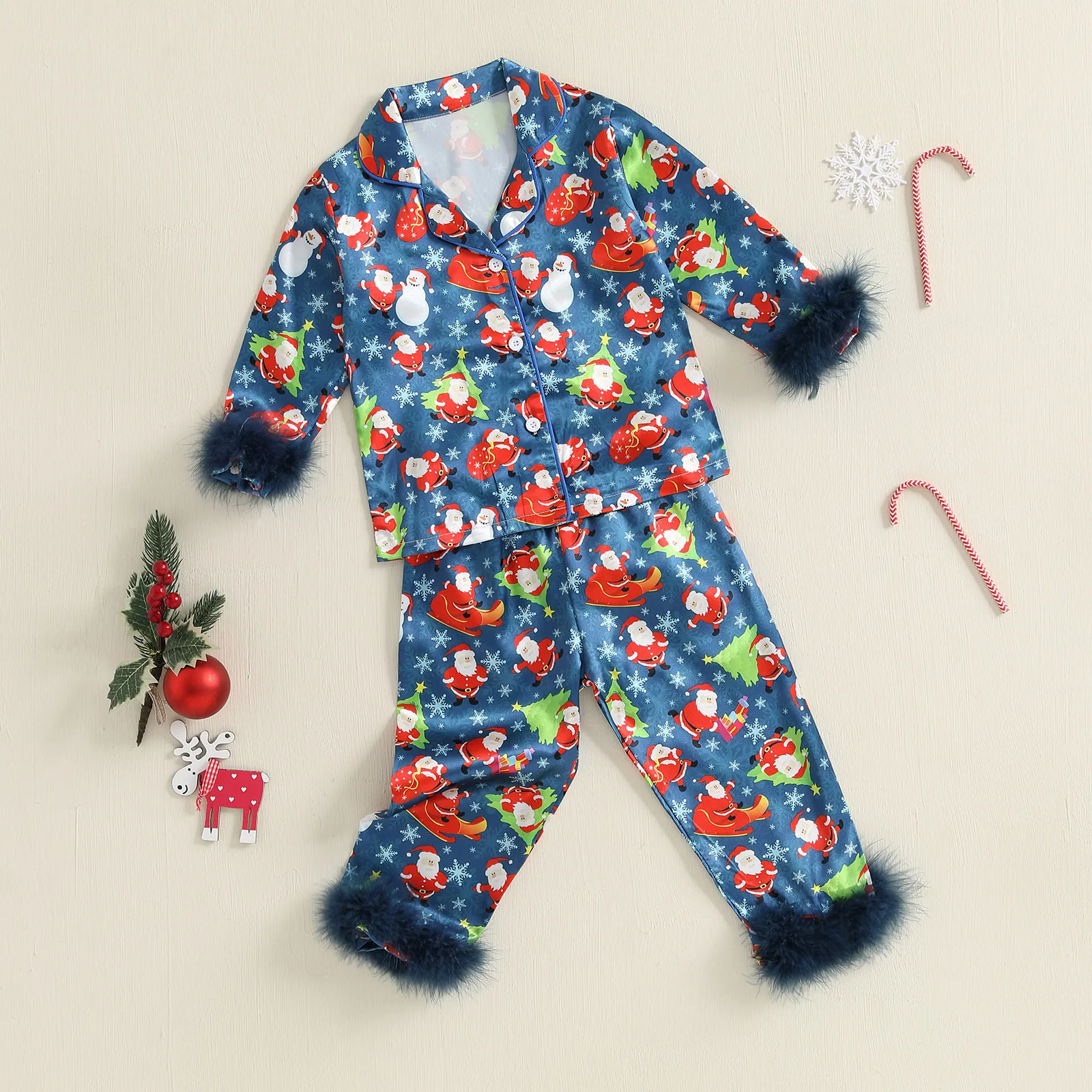 Girls Pajamas Set Feather Trim Christmas Print Button up Long Sleeves Shirt with Elastic Pants for Loungewear Sleepwear