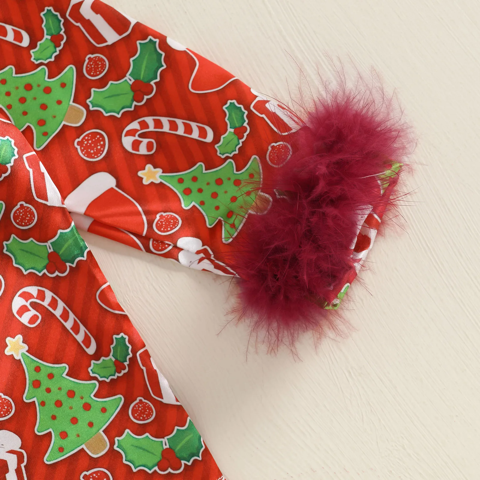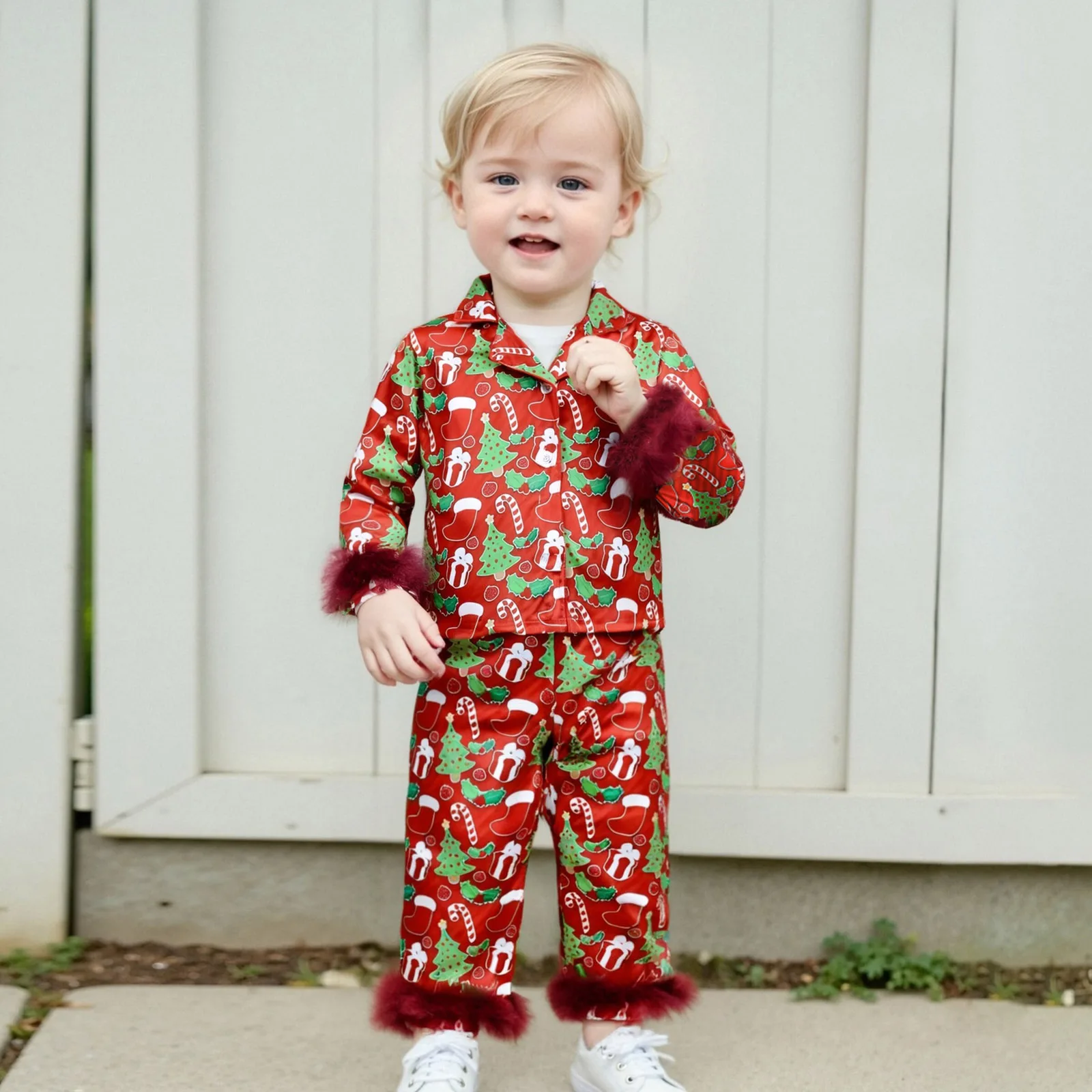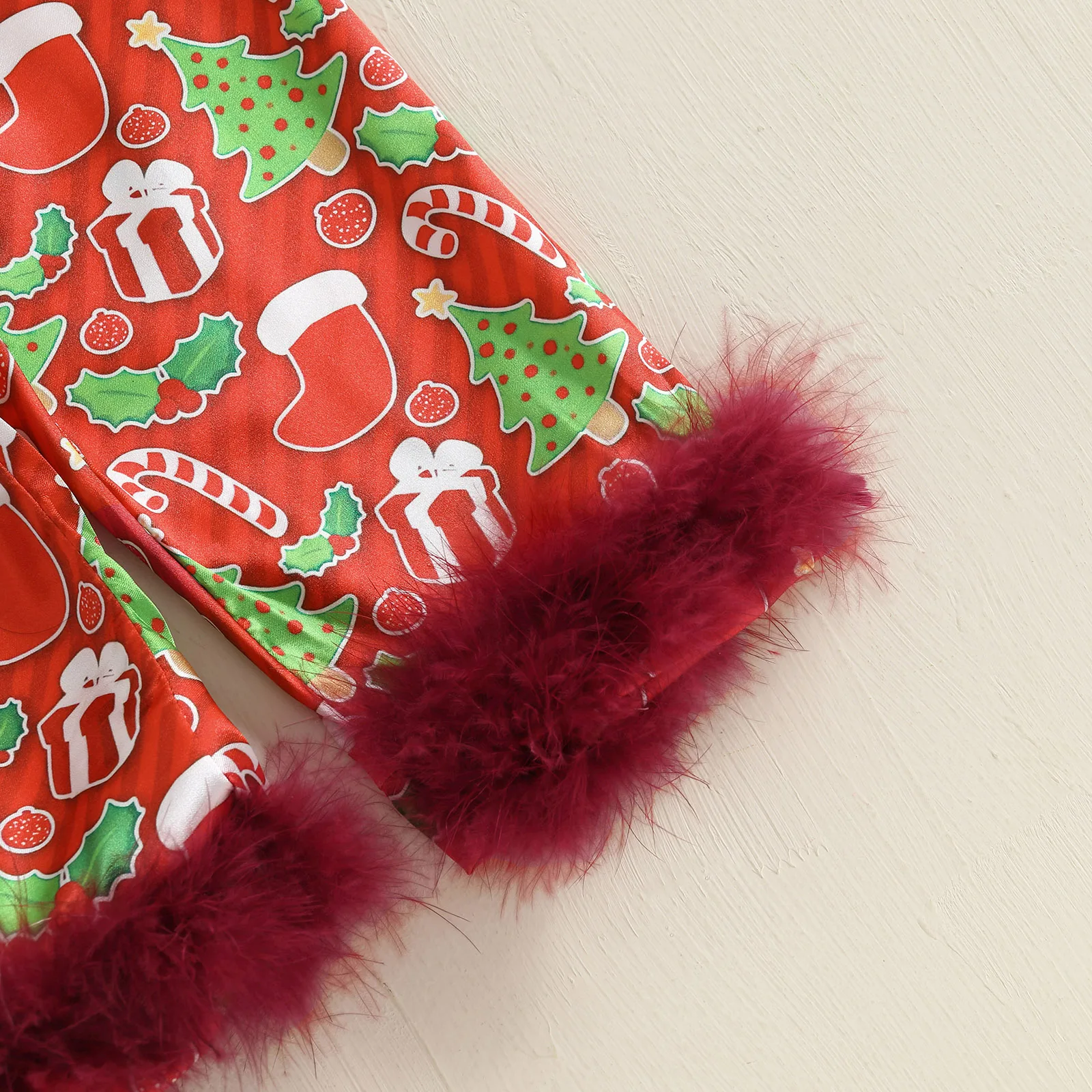 Girls Pajamas Set Feather Trim Christmas Print Button up Long Sleeves Shirt with Elastic Pants for Loungewear Sleepwear