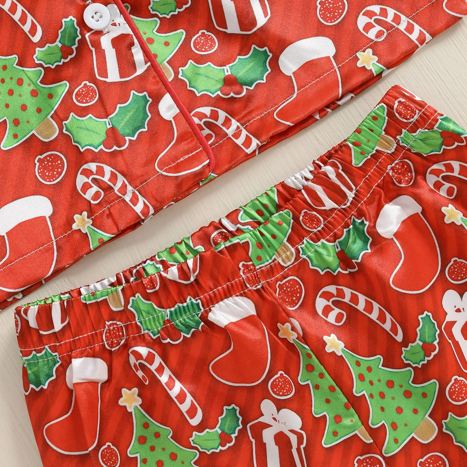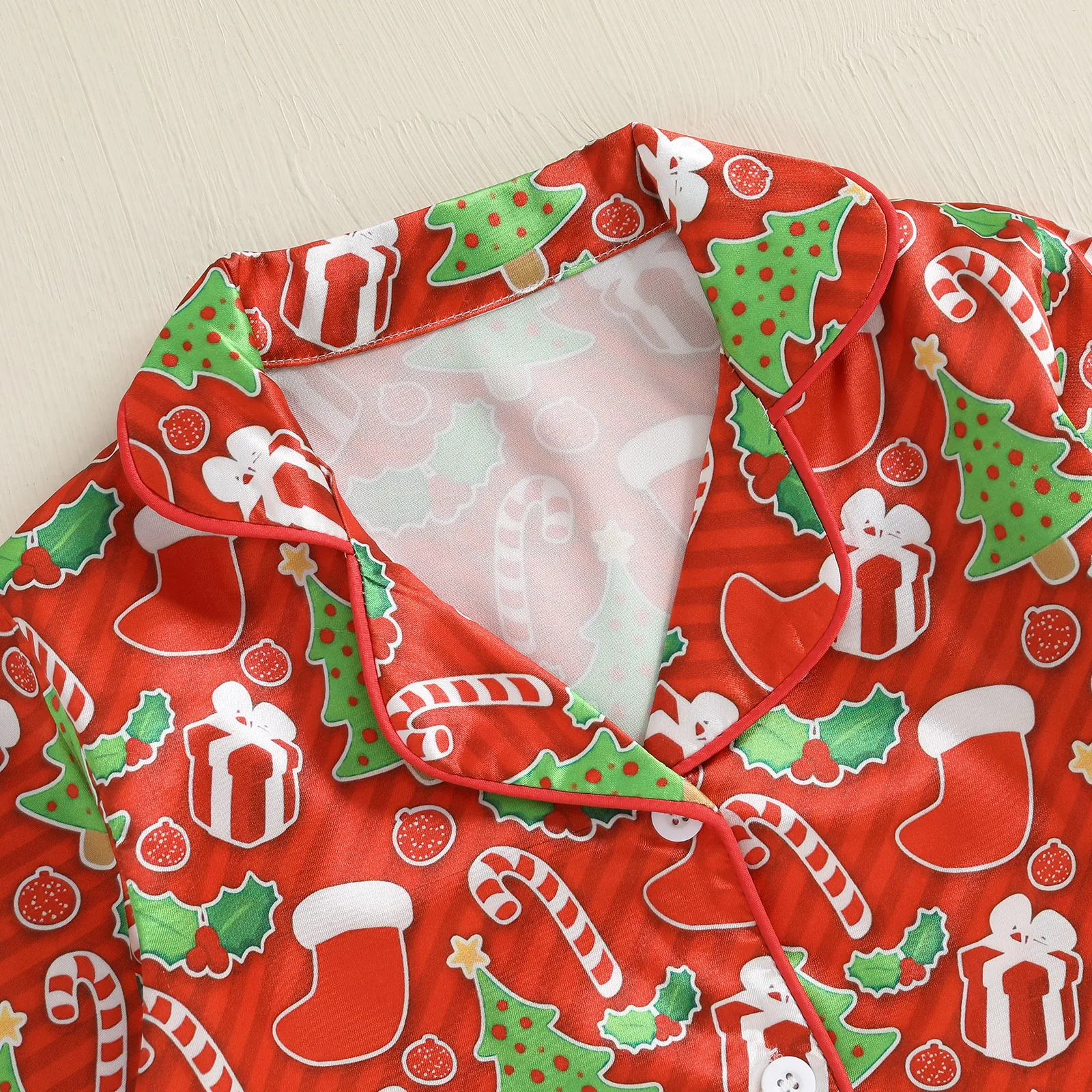 Christmas element print with feather trim; Girls pajama shirt with long sleeves, front button closure and lapel collar; Pajama pants with elastic waist, simple and fashionable