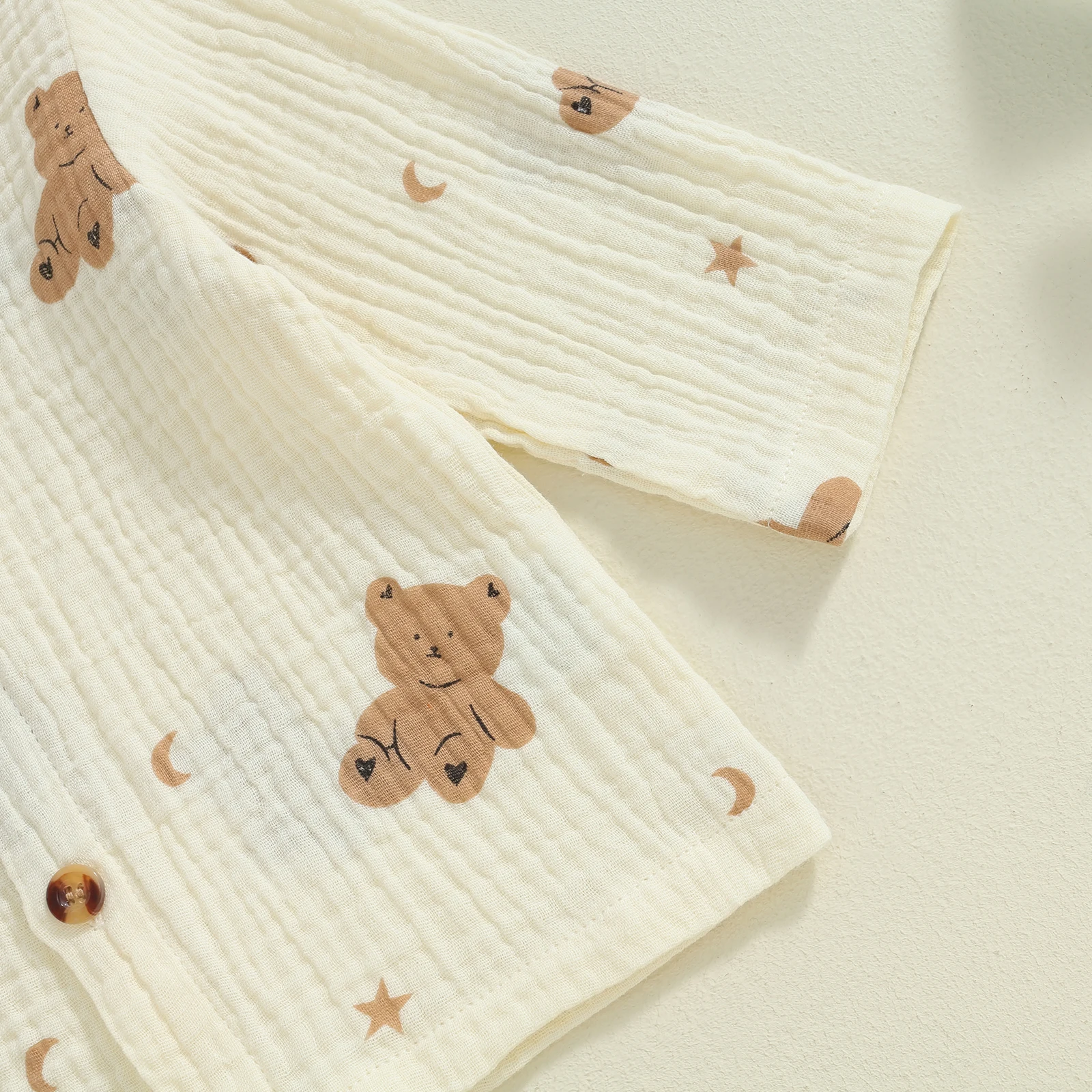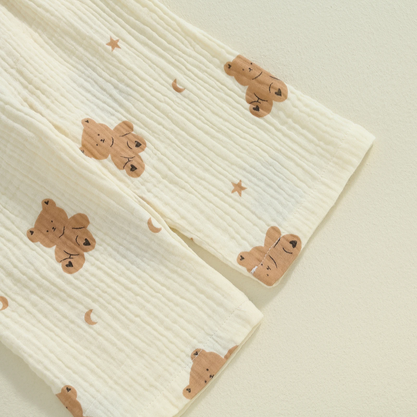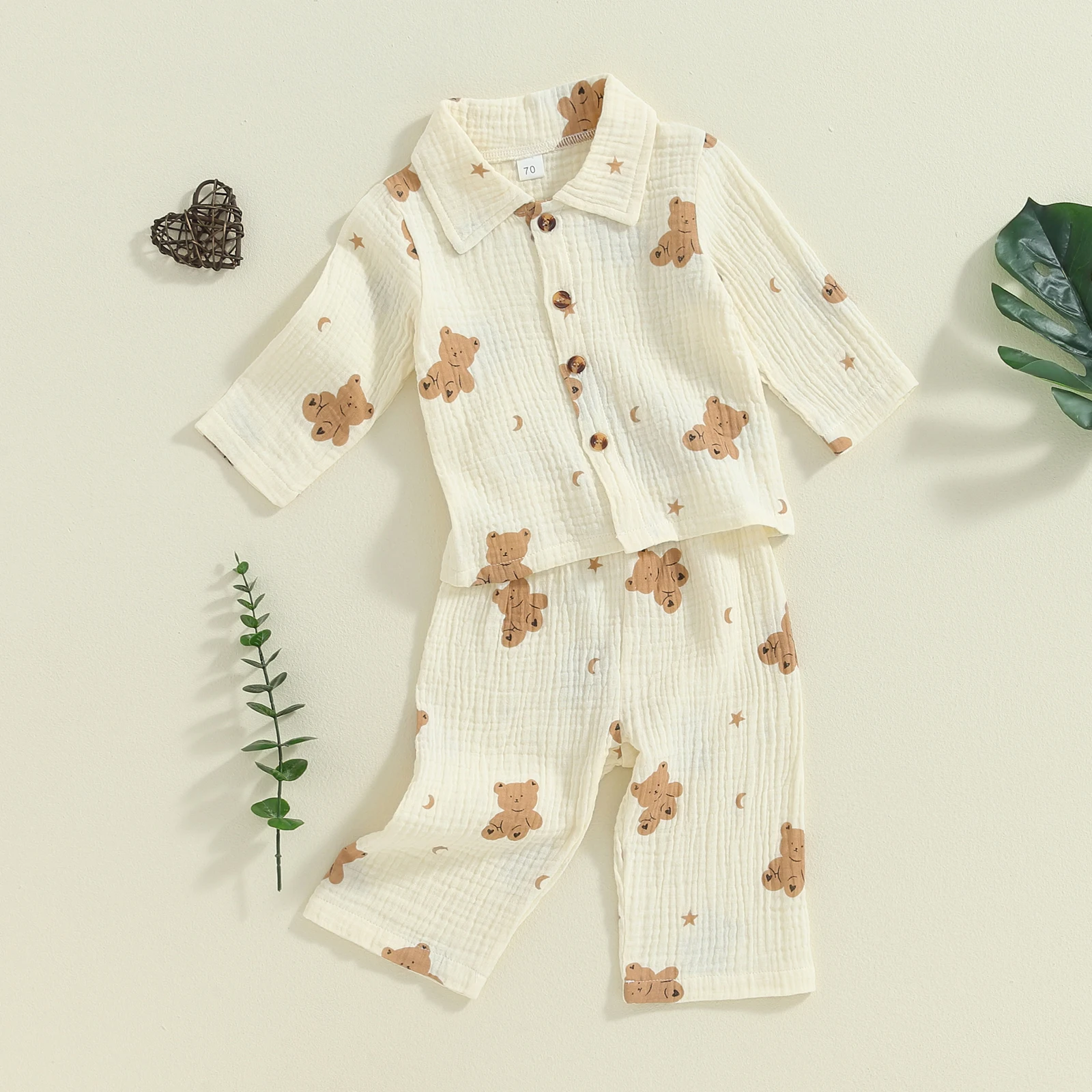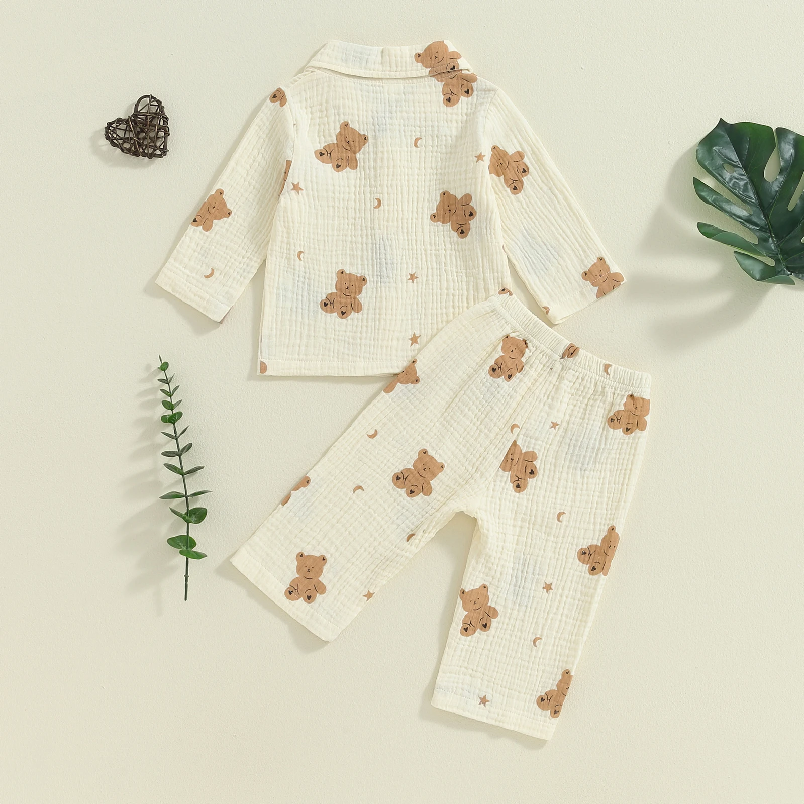 Little Girl Boy Fall Pajamas Set Bear Print Long Sleeve Lapel Button Down Tops with Elastic Waist Pants Sleepwear