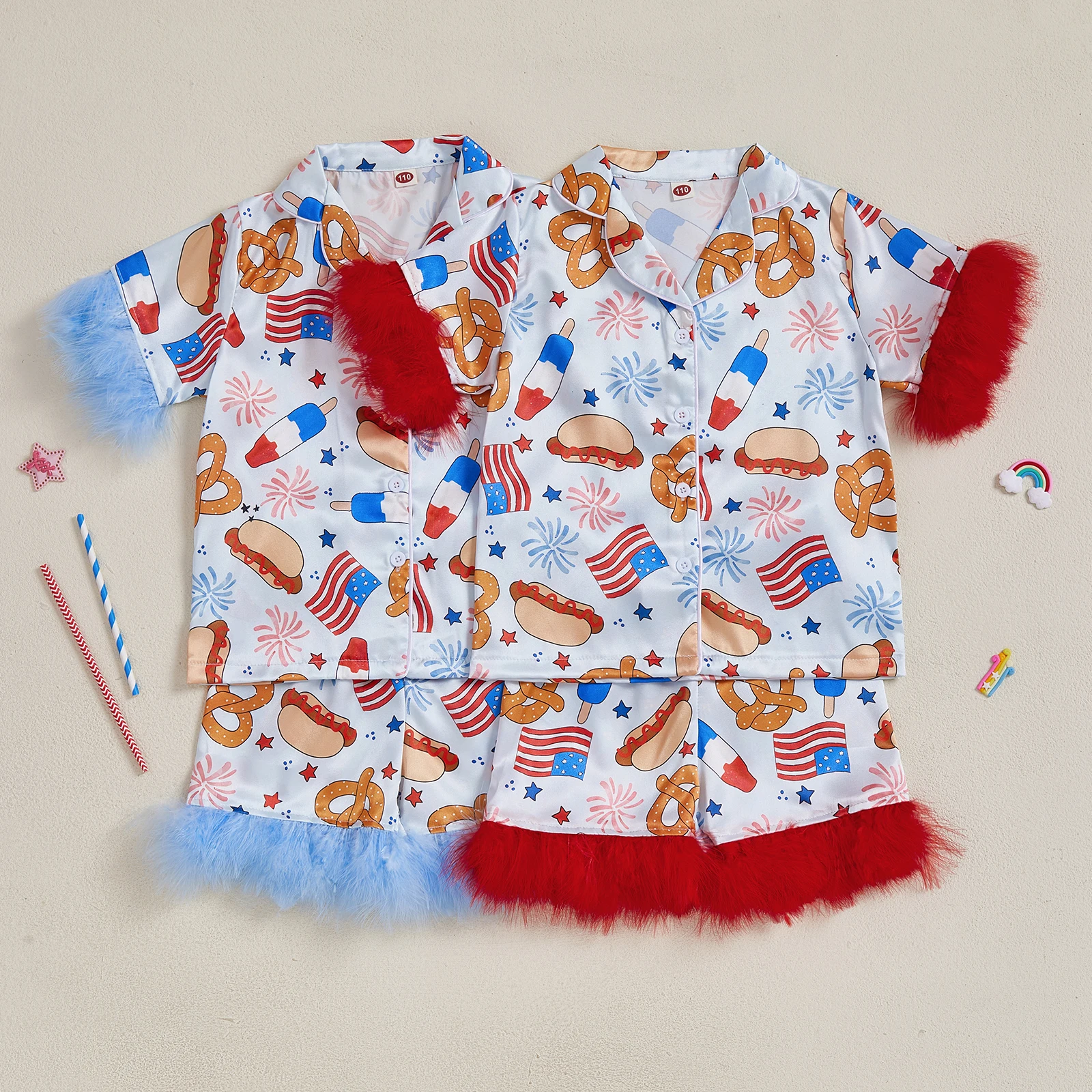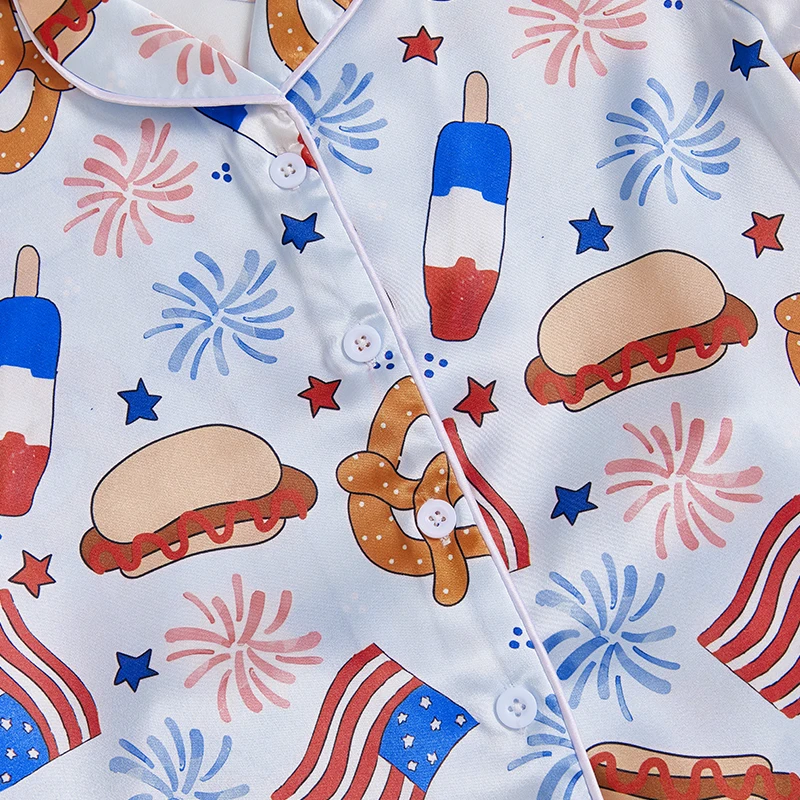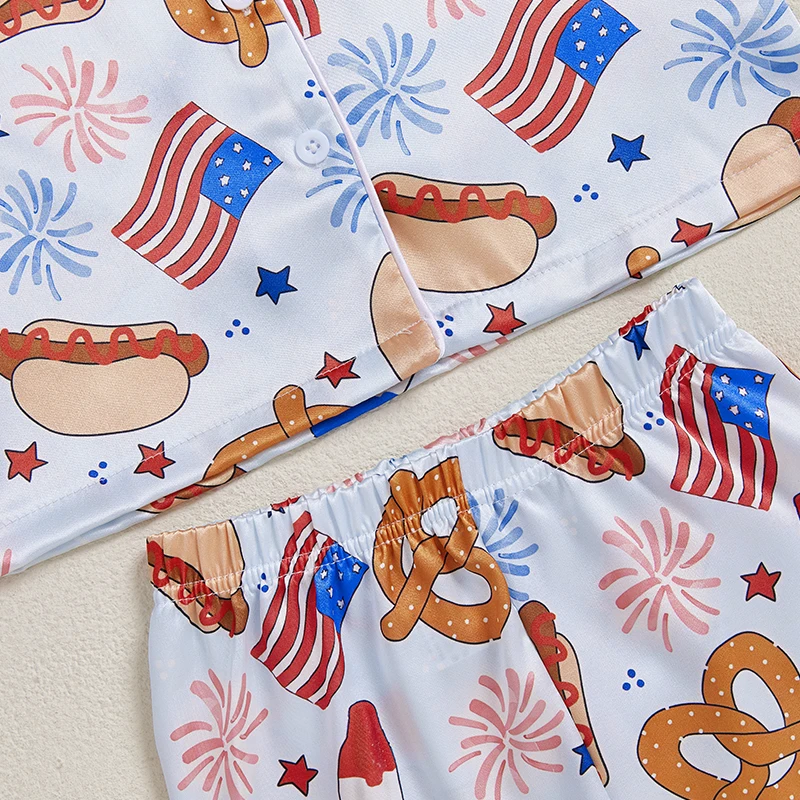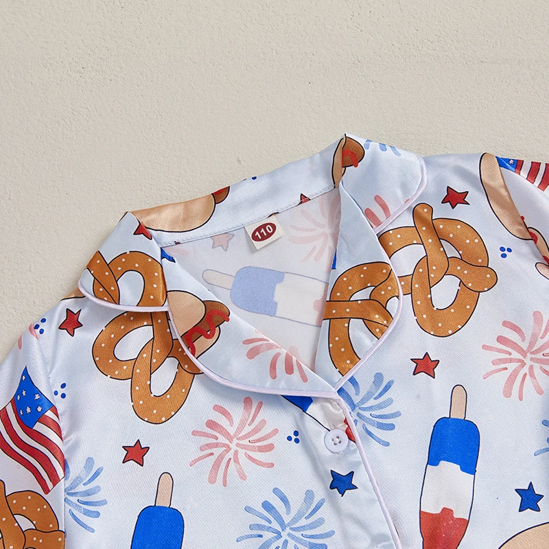 MISOWMNJOY Satin Kids Girl 4th of July Pajama Set Popsicle Burger Fuzzy Trim Short Sleeve Button-up Tops Shorts Kids Sleepwear