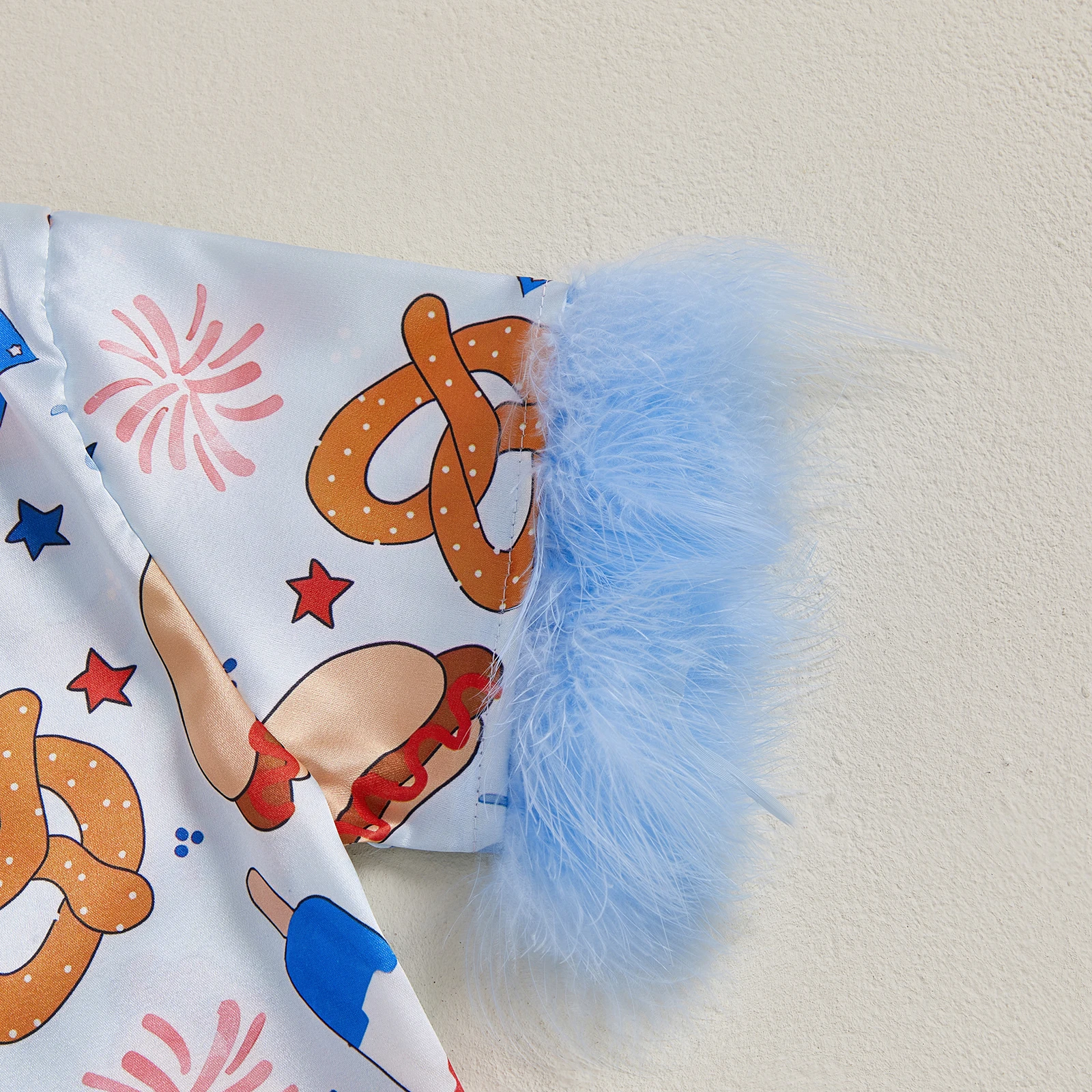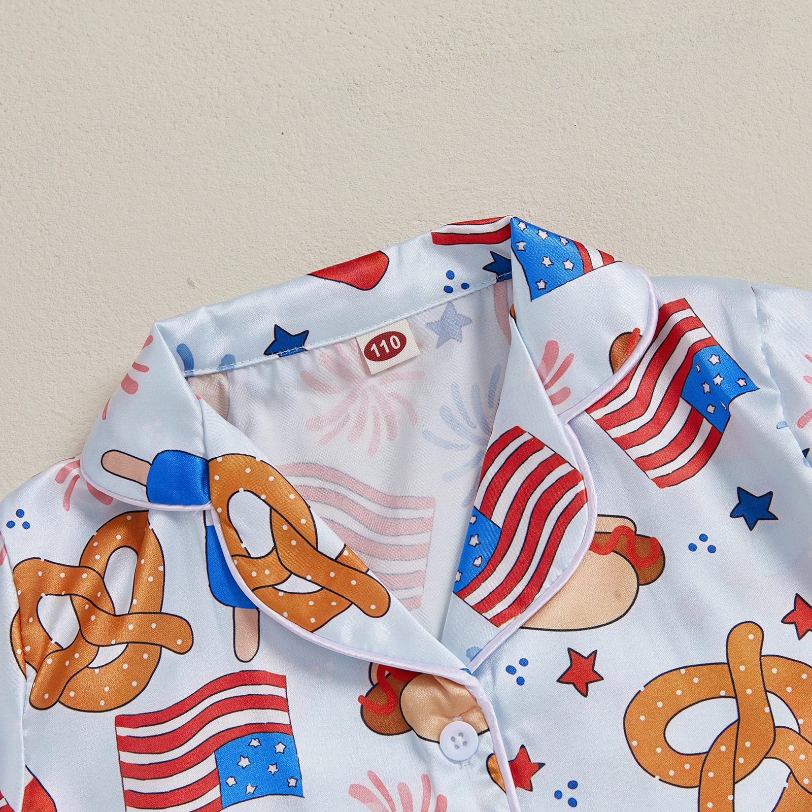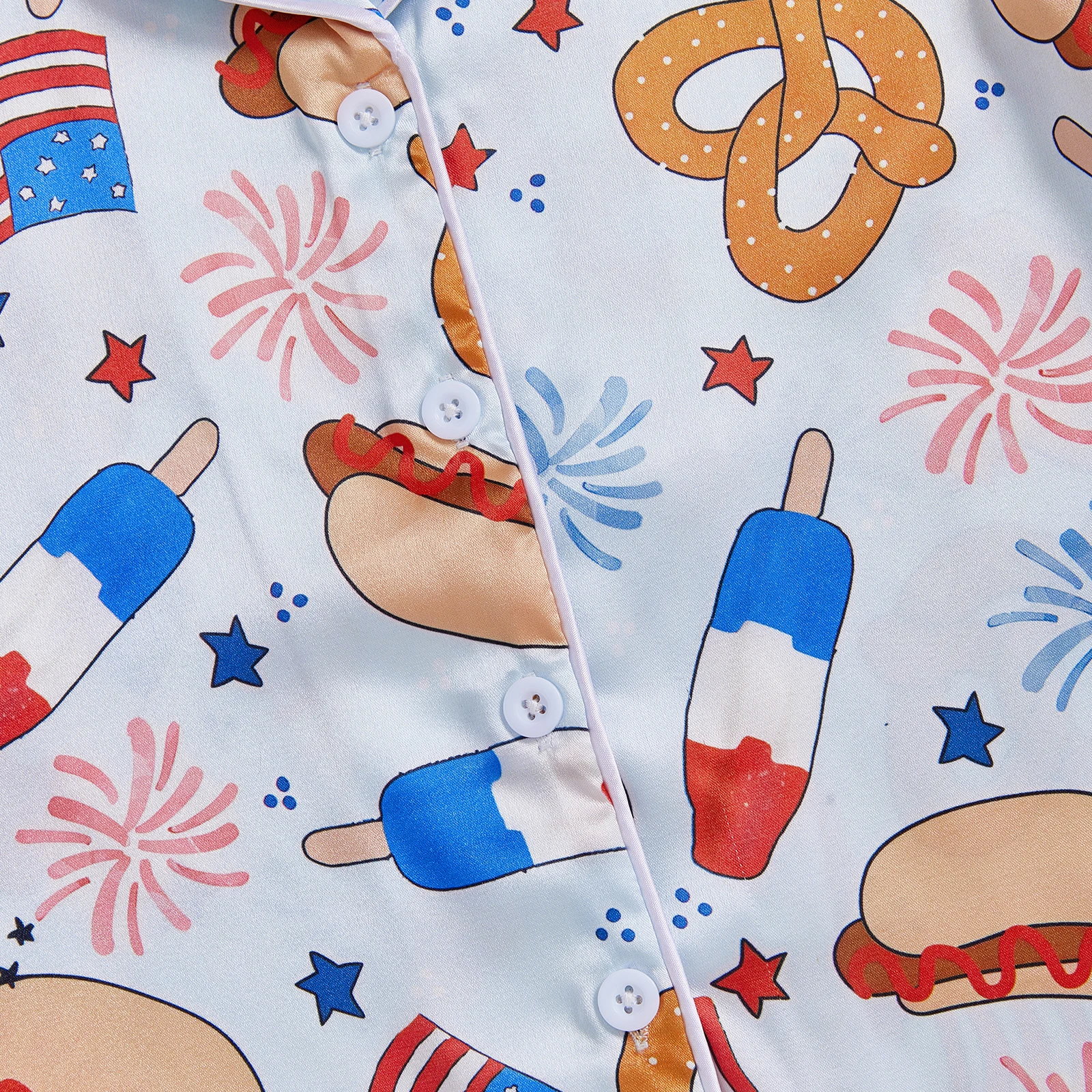 MISOWMNJOY Satin Kids Girl 4th of July Pajama Set Popsicle Burger Fuzzy Trim Short Sleeve Button-up Tops Shorts Kids Sleepwear