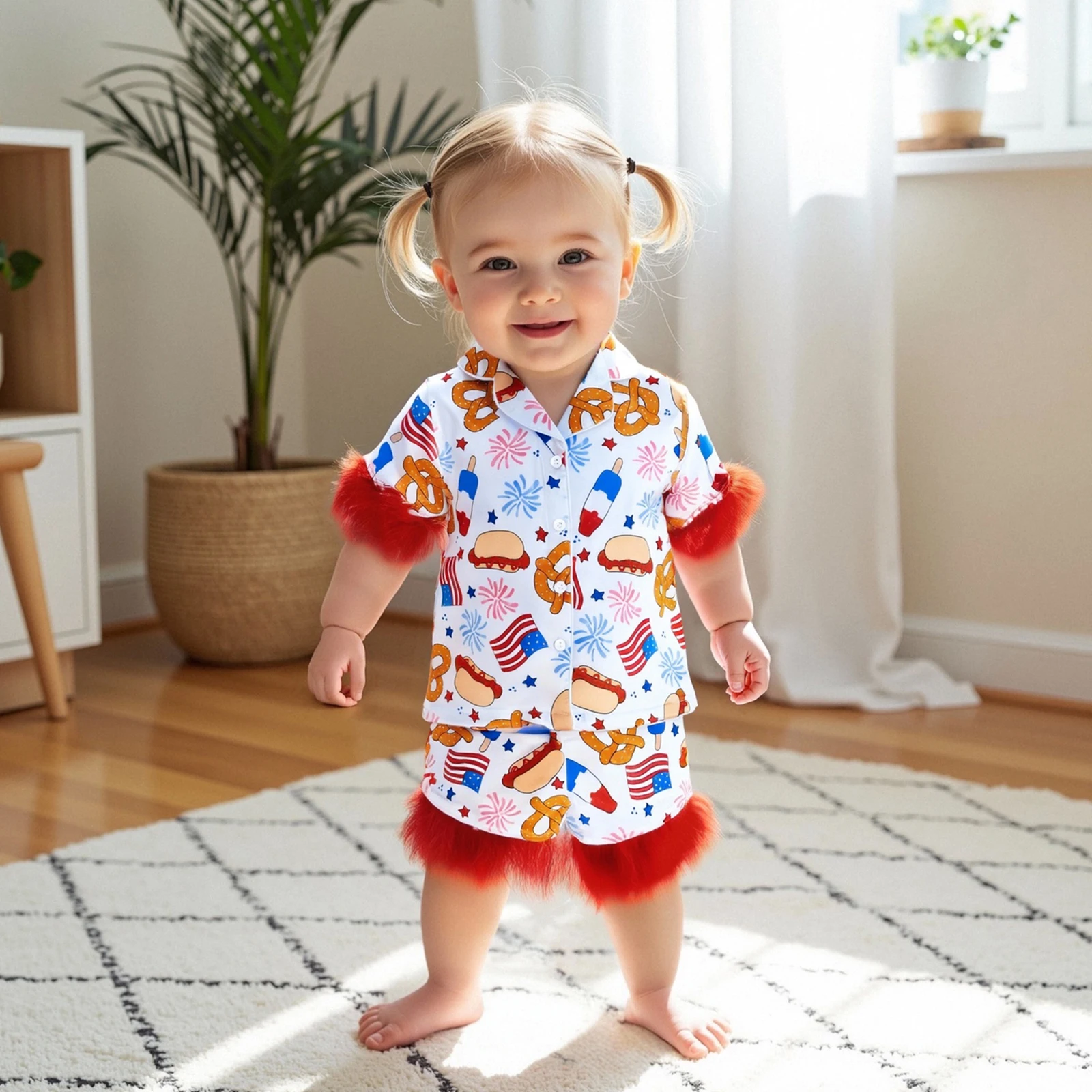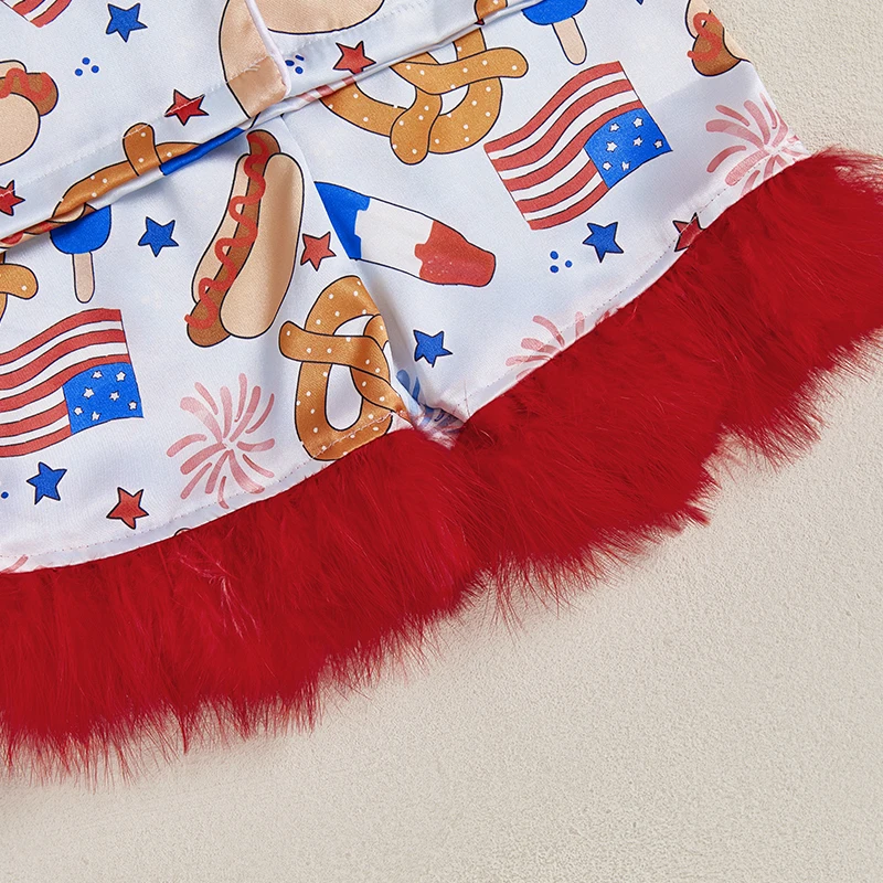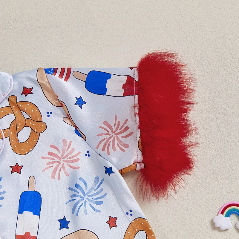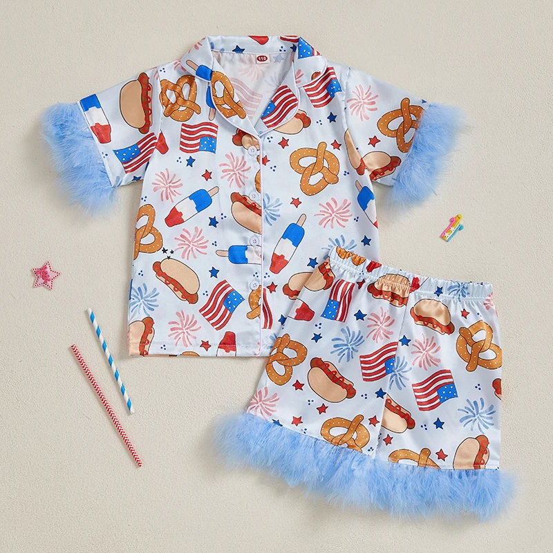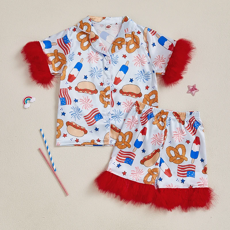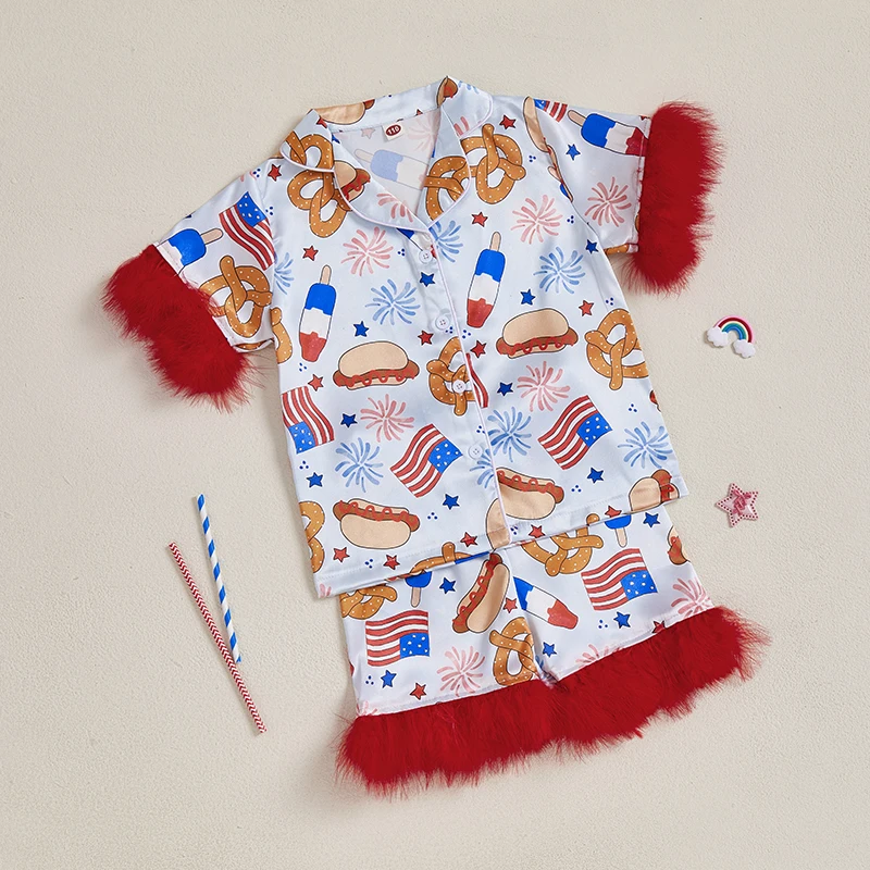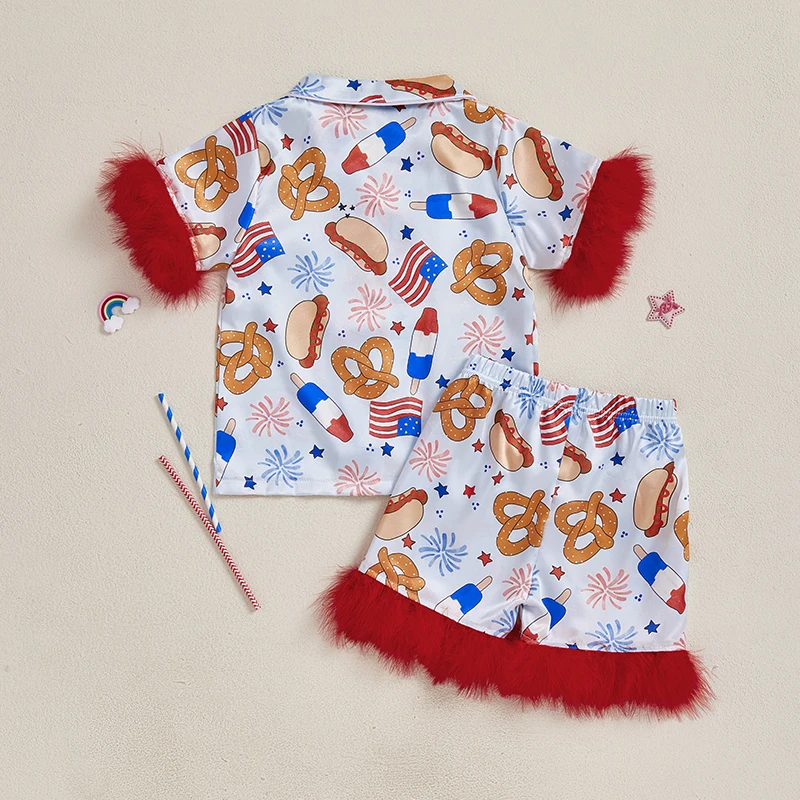 Girl 4th of July Pajama Set Popsicle Burger Fuzzy Trim Short Sleeve Button-up Tops Elastic Waist Shorts 2 Piece Sleepwear Outfit