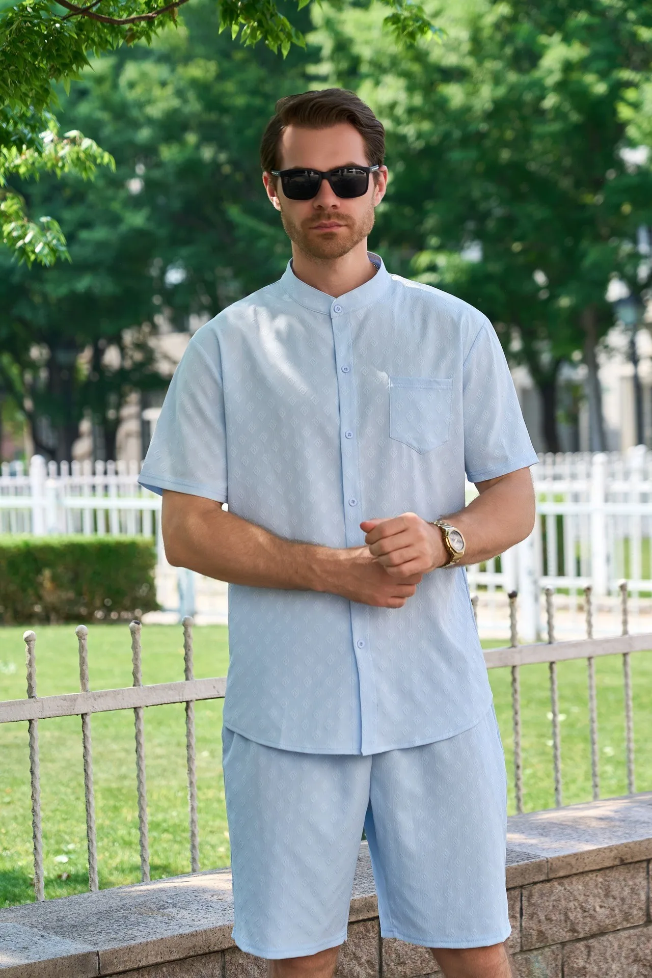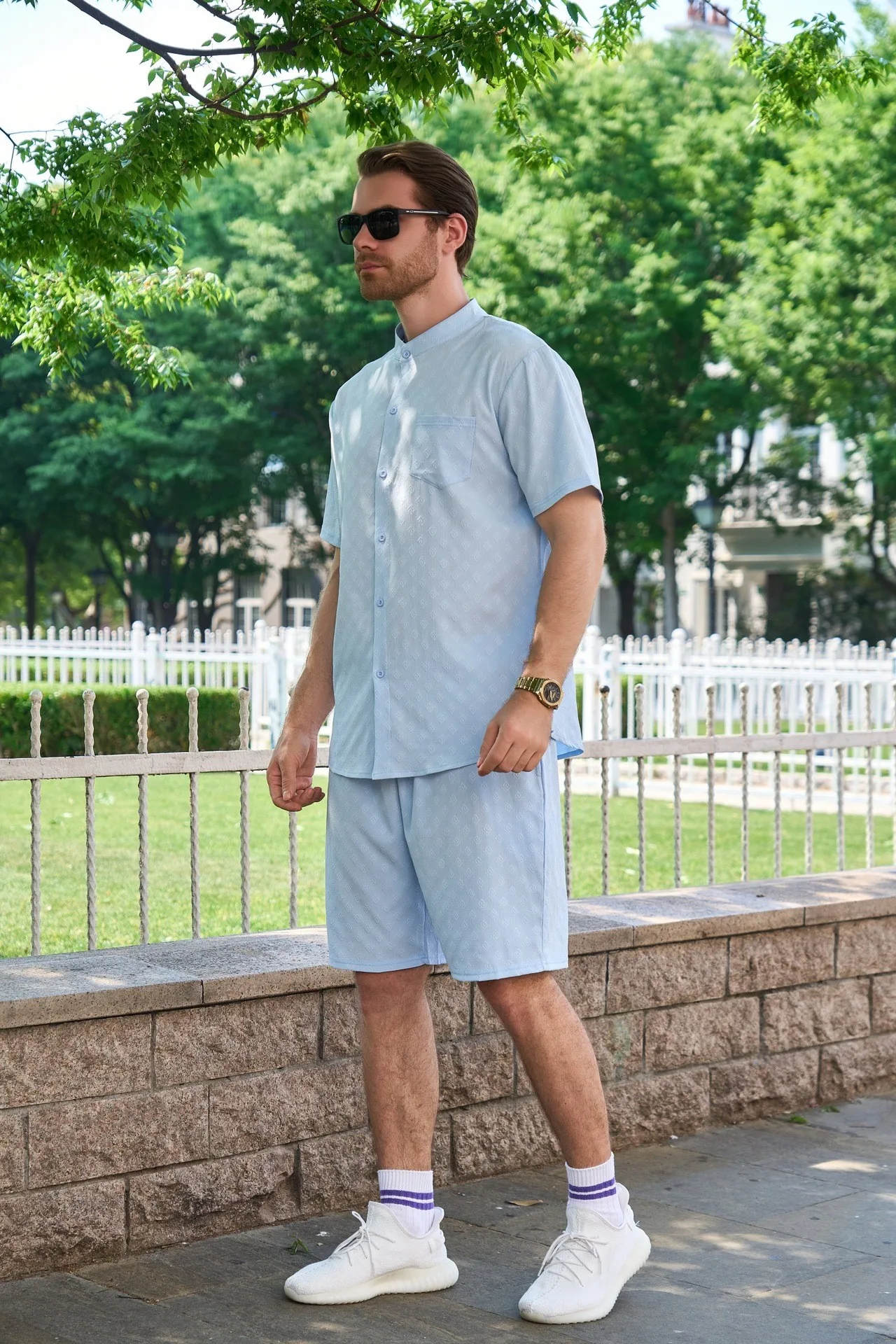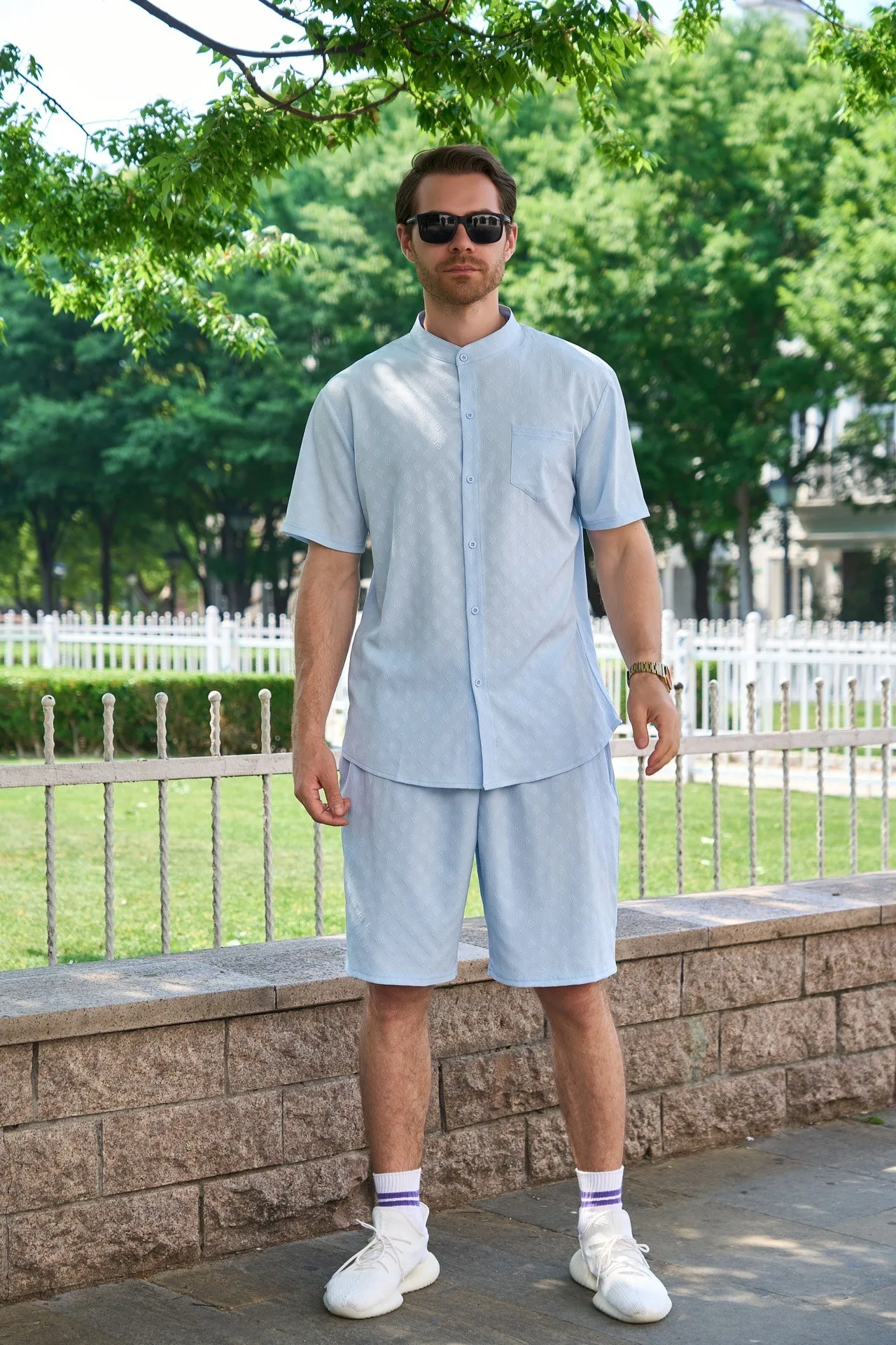 New summer European and American men’s jacquard shirt, checkeredcasual stand-up collar pocket cardigan short sleeve and shortset