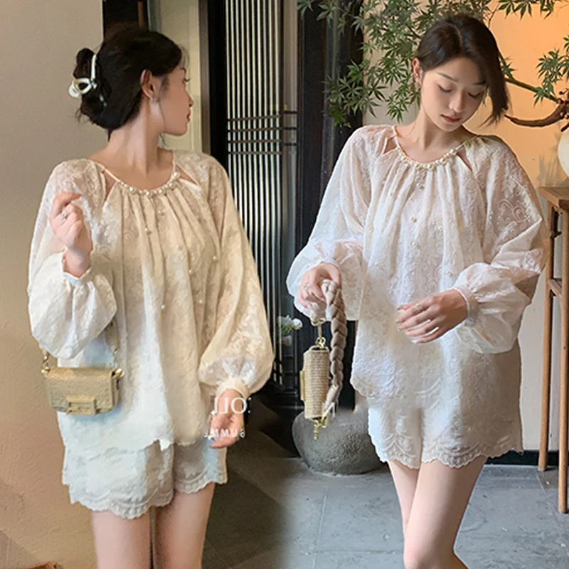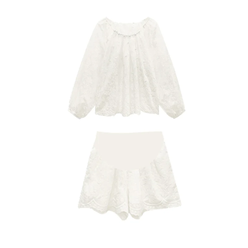 Sweet Summer Maternity Clothes Set Thin Long Seeve Beaded Lace Shirts Belly Shorts 2pcs Pants Suits Pregnant Woman Shorts Suits