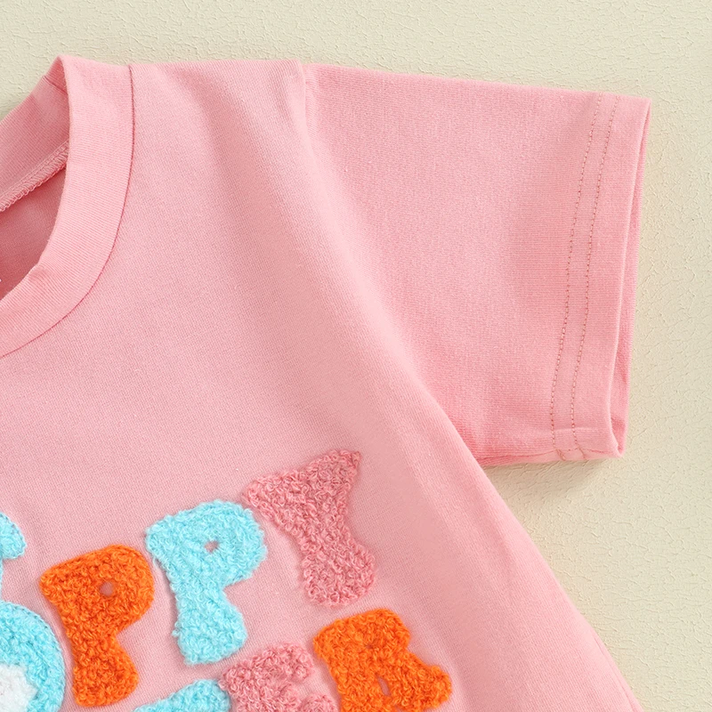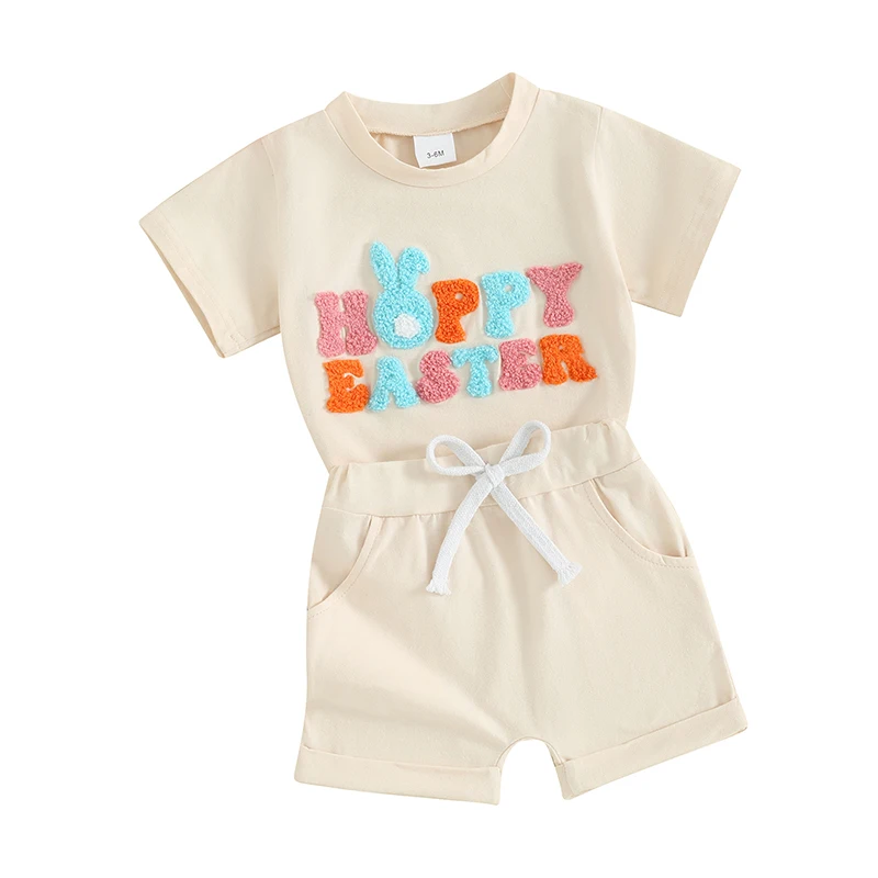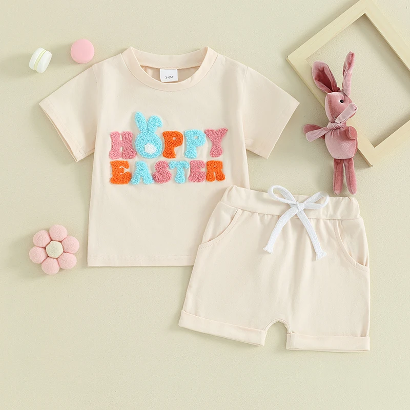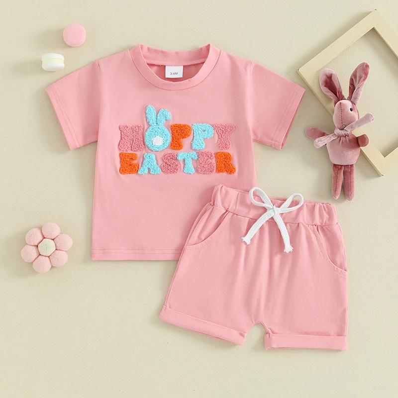 Toddler Girl Easter Outfits Fuzzy Letter Bunny Embroidery Short Sleeve T-Shirts Elastic Waist Shorts 2Pcs Summer Clothes Set