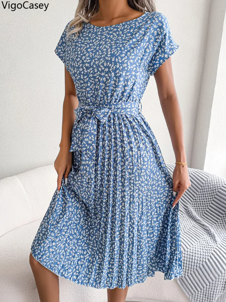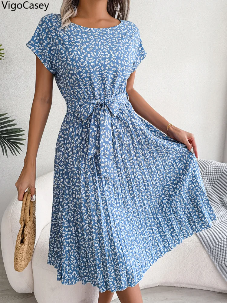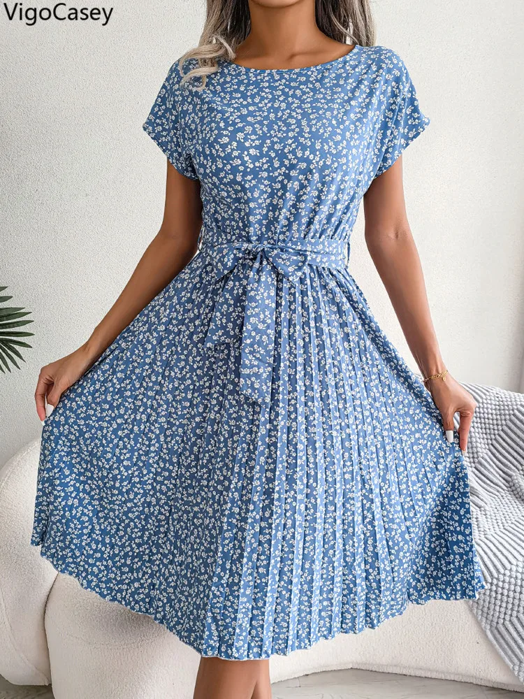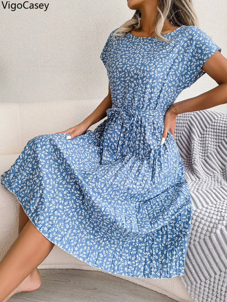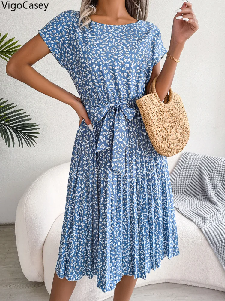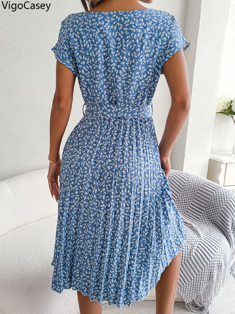 VigoCasey 2025 Elegant Print O Neck Short Dress Women Sexy Cross Short Sleeve Clud Dress Lady Casual Belt Summer Tight Dresses