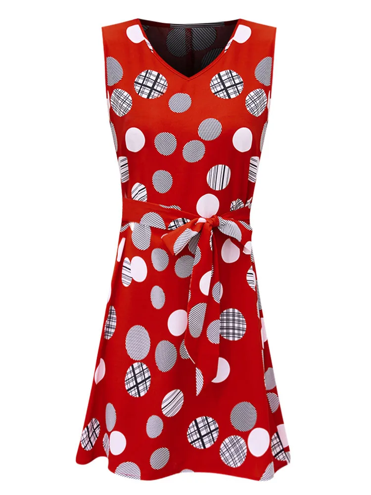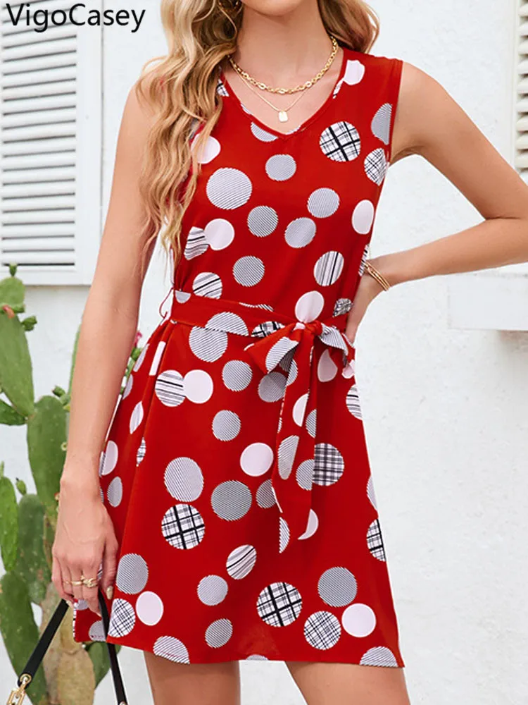 VigoCasey 2025 Summer Female Dot Print Mini Dress Women Sexy Sleeveless V Neck Clud Dress Lady Casual Belt Tight Short Dresses