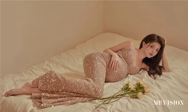 Women Photography Props Gold Blingbling Elegant Maternity Dresses Sleeveless Pregnancy Dress Studio Shooting Photo Prop