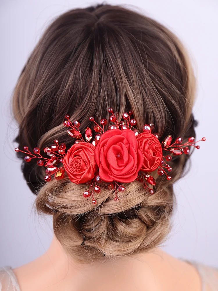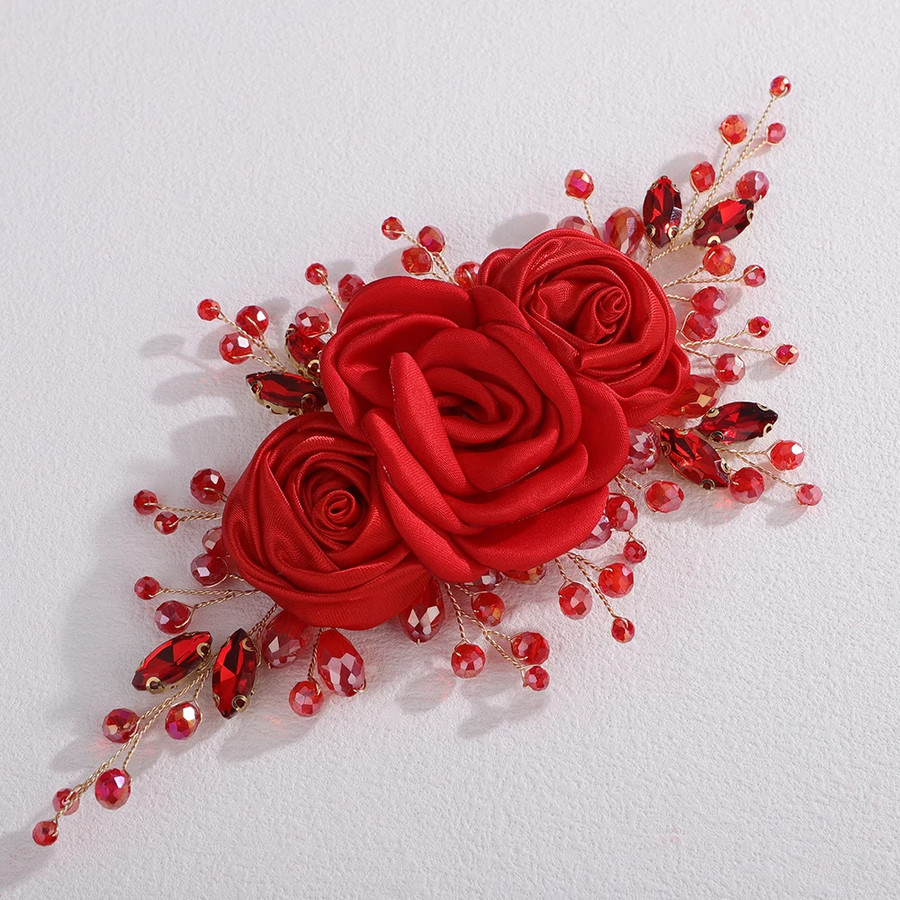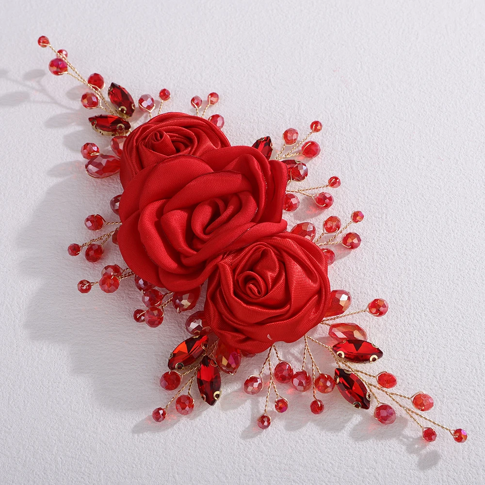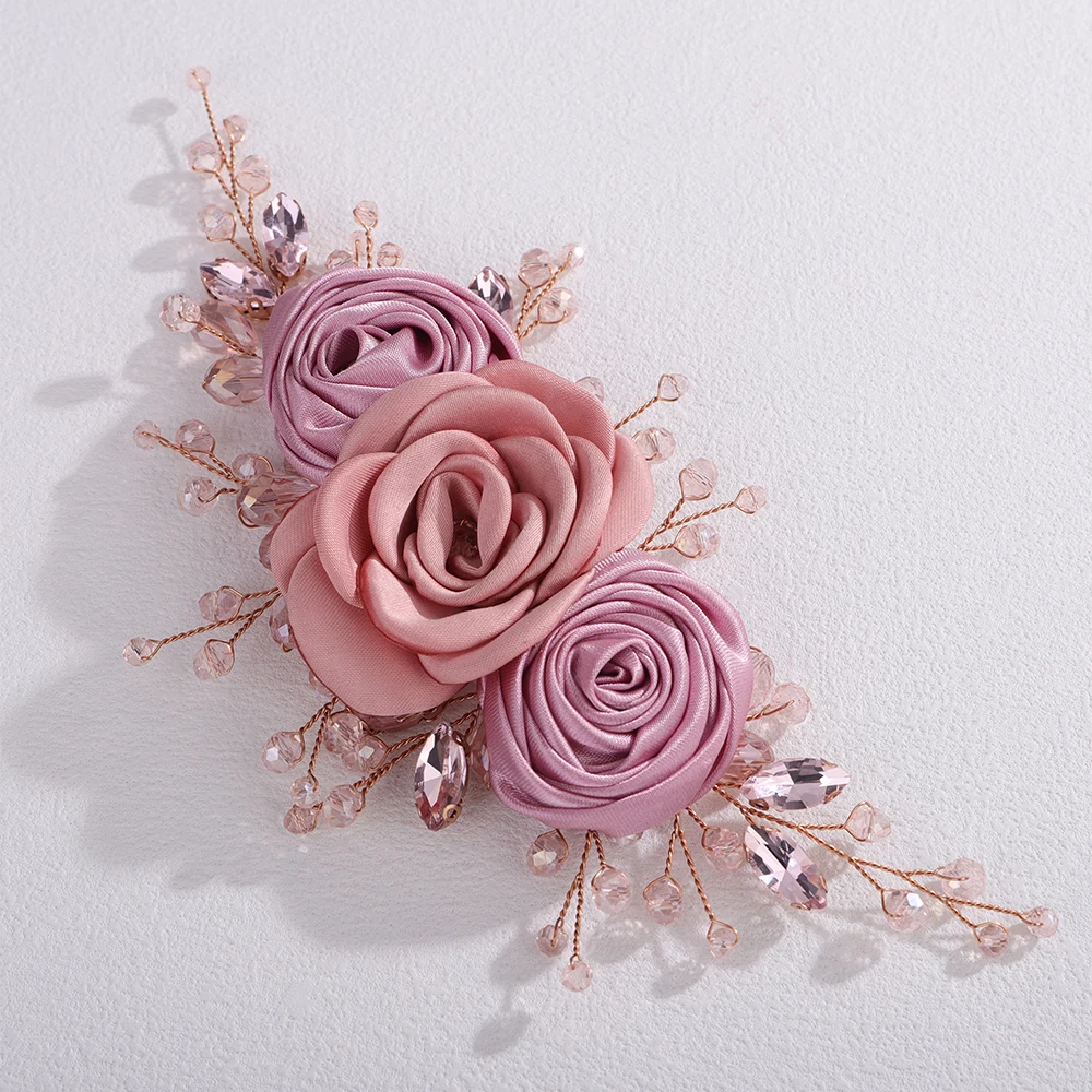 Women Silk Flower Headband Silver Pink Wedding Hair Accessories Rhinestone Crystal Handmade Bridal Hair Vine Blue Red Headpiece