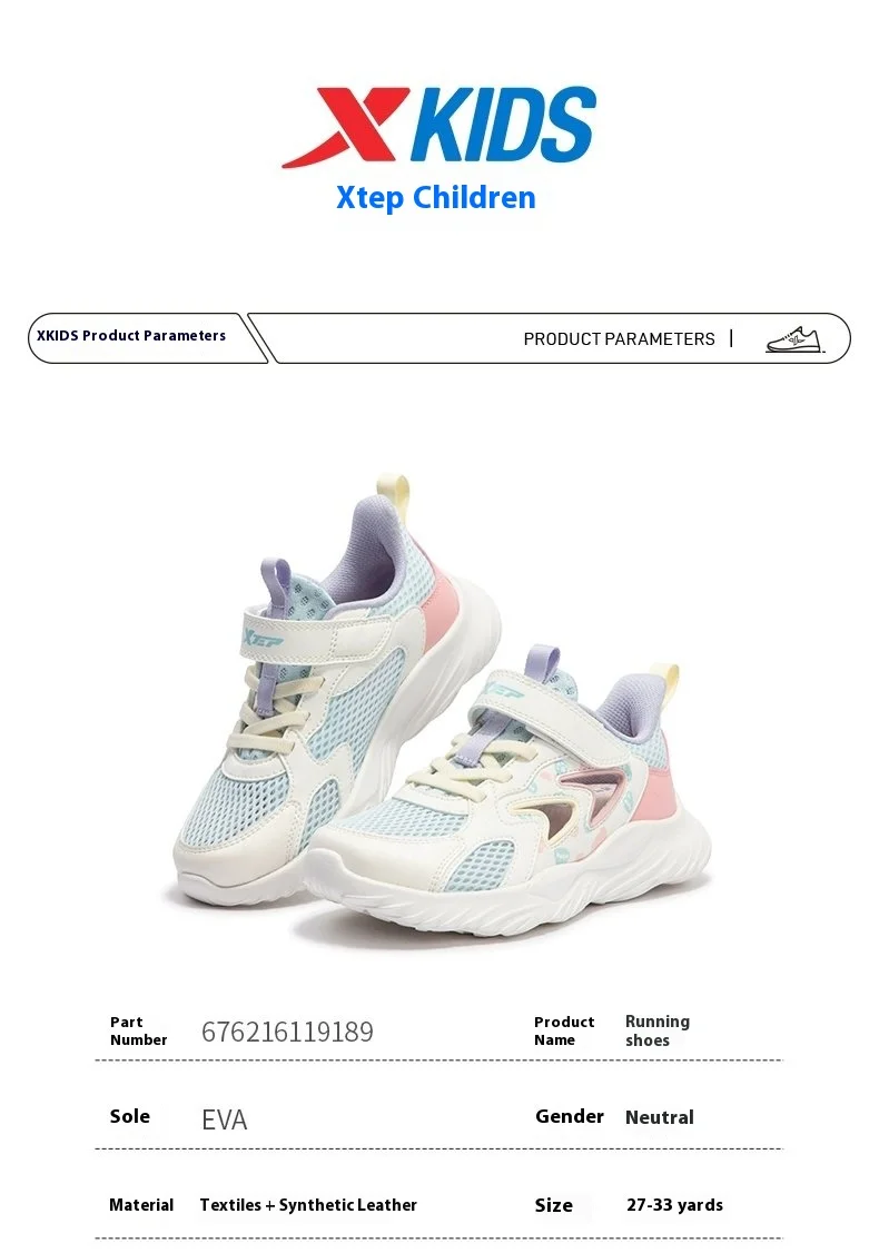 Xtep Kid’s Running Shoes Unisex 2024 Summer Mesh Breathable Lightweight Comfortable Sport Shoes 676216119189