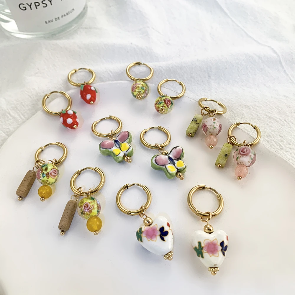 Y2k Aesthetic Hand Painted Butterfly Earrings for Women Stainless Steel Circle Huggies Flower Heart Bead Hoop Earring 2022 Trend