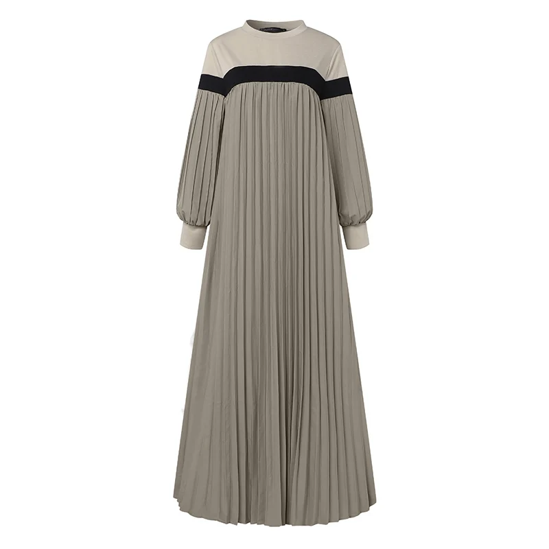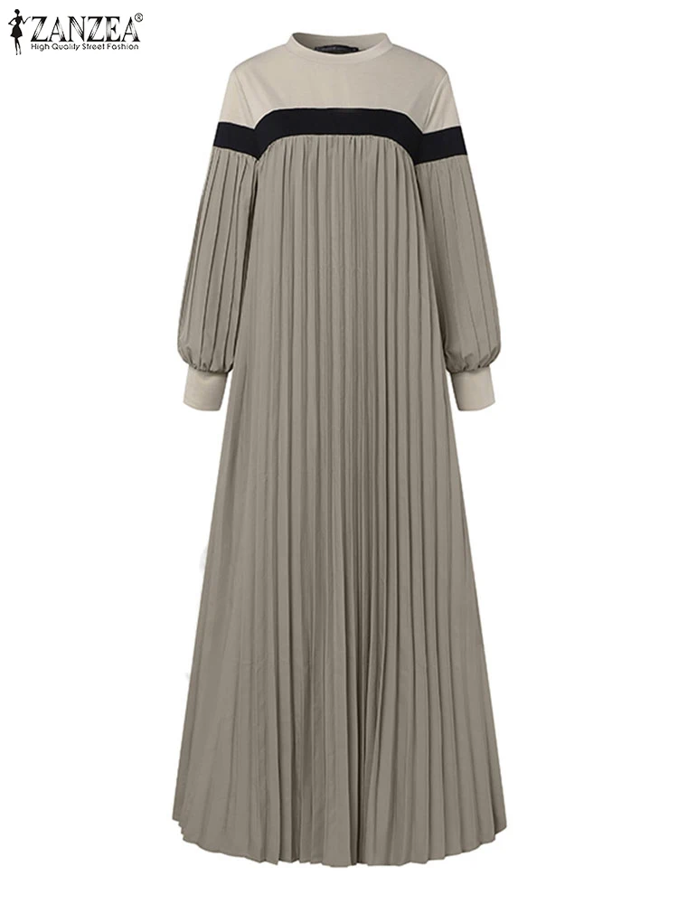 ZANZEA Women Color Block Pleated Dress Elegant Long Lantern Sleeve Patchwork Muslim Fashion Abaya Islamic Hijab Casual Long Robe